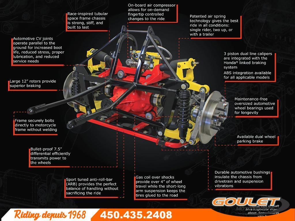 KIT MOTOR TRIKE POUR HONDA GOLDWING BAGGER GÉNÉRATION 2018-2026 \*\*\* Prix pour kit installé\*, moto non incluse - contactez-nous pour une soumission sur votre moto \*\*\* Transforme ton Honda Goldwing GL1800B en trike avec suspension indépendante arrière avec un kit Motor Trike. Le kit Condor IRS de Motor Trike est spécifique aux Goldwing de 2018 et plus, que ce soit le bagger, DCT ou Airbag. C'est le trike le plus confortable et stable grâce à sa suspension indépendante arrière ajustable à l'air. Vivez la meilleure expérience de votre vie. Avec ses lignes de carrosserie audacieuses, parfaitement adaptées à notre suspension arrière indépendante la plus agressive à ce jour, la conversion Condor pour motos Honda Gold Wing vous permet de contrôler votre moto. Goulet Moto Sports fait des transformations Trike depuis plus de 25 ans avec plus de 200 conversions en trike depuis le début. Nous sommes les experts et les premiers à en faire au Québec. LE KIT MOTOR TRIKE CONDOR IRS - Spécifique pour les Honda Goldwing 2018 a 2025 - Suspension Indépendante Arrière (IRS) - Compresseur à air pour l'ajustement de la suspension - Plus de 10 cm de débattement de suspension - Amortisseurs à ressorts progressifs et ballons d'air pour l'ajustement. Commande de suspension visuelle à l'avant - Système arrière de frein à disque avec kit ABS arrière - Prise de courant 12 volts dans le coffre - Peinture et installation inclus - Avance de fourche (rake kit) de 6 degrés pour faciliter la conduite disponible - Frein à main disponible pour les modèles manuel (non-inclus) Plusieurs accessoires en option pour une transformation à ton goût comme les marchepieds color match avec des fog au choix, peinture spéciale, les protèges ailes en cuir, le bumper arrière, un choix de roue (mag) optionnel pour rehausser le look. Tapis de valise, avance de fourche et même la renverse pour faciliter la conduite. Une transformation Motor Trike est faite sur commande et peut prendre de 3 à 7 semaines pour être complété selon les options et peintures. Tout est fait chez Motor Trike, même la peinture. Goulet Moto Sports s'occupe de la transformation finale et de l'installation sur votre moto de choix. Nous pouvons aussi nous occuper de la certification à la SAAQ. Voir les conditions chez Goulet Moto Sports. \* Le prix est approximatif et peux varier selon le moment de la commande et les options. Il inclus l'installation et la peinture 1 ton, prêt à partir. Le taux de change, coût de transport, accessoires, tarifs douaniers et autres conditions peuvent affecter le prix. Possibilité de financement avec plusieurs institutions financières. 2ième chance au crédit disponible. Non combinable à toute autre offre. Goulet Moto Sports est votre concessionnaire moto depuis 1968. Fier représentant officiel des marques HONDA, APRILIA, MOTO GUZZI, VESPA, PIAGGIO, KTM, NIU, SURRON et URAL pour le grand Montréal. Nous avons un énorme choix de moto usagés inspectées par nos professionnels. 2 adresses pour vous servir, soit à Sainte-Thérèse (450.435.2408) et Saint-Jérôme (450.431.6622). Goulet Moto Sports ne peut être tenu responsable d'une omission, d'un délai ou d'une erreur de transcription de l'information. Le prix affiché reflète la condition de l'unité. Pour différentes raisons les prix peuvent différer de ceux indiqués en ligne. Les données sont affichées à titre indicatif seulement et ne peuvent être considérées comme une information contractuelle. Nous vous encourageons vivement à nous consulter pour plus de détails avant de vous déplacer. Des frais tels que taxes, immatriculation, administrations, transport, certification, tarif douanier ou taux de change et autres peuvent s'appliquer ou affecter le prix. Se compare avantageusement a un trike California Sidecar (CSC), Harley Davidson Trike tri glide, BRP Spyder Garantie: 3 ans ---------------------- MOTOR TRIKE KIT FOR HONDA GOLDWING BAGGER GENERATION 2018-2026 \*\*\* Price for installed kit\*, motorcycle not included - contact us for a quote on your motorcycle\*\*\* Transform your Honda Goldwing GL1800B into a trike with independent rear suspension with a Motor Trike kit. The Condor IRS kit from Motor Trike is specific to Goldwings from 2018 and up, whether bagger, DCT, or Airbag. It's the most comfortable and stable trike thanks to its air-adjustable independent rear suspension. Have the best ride of your life. With its bold body lines, perfectly matched to our most aggressive independent rear suspension to date, the Condor conversion for Honda Gold Wing motorcycles puts you in control of your bike. Goulet Moto Sports has been doing trike conversions for over 25 years, with over 200 trike conversions since its inception. We are the experts and the first to do so in Quebec. THE CONDOR IRS MOTOR TRIKE KIT - Specific for 2018 to 2025 Honda Goldwings - Independent Rear Suspension (IRS) - Air compressor for suspension adjustment - Over 10 cm of suspension travel - Progressive spring shock absorbers and air chambers for adjustment. Visual suspension control at the front - Rear disc brake system with rear ABS kit - 12-volt power outlet in the trunk - Painting and installation included - 6-degree fork rake kit for easier handling - Parking brake available for manual models (not included) Several optional accessories for a transformation to your liking, such as color-matched running boards with fog lights of your choice, special paint, leather fender guards, rear bumper, and optional wheel (mag) choices to enhance the look. Luggage mats, fork rake, and even a rear brake sprocket for easier handling. A Motor Trike conversion is custom-made and can take 3 to 7 weeks to complete depending on the options and paint job. Everything is done at Motor Trike, even the paint job. Goulet Moto Sports handles the final conversion and installation on your chosen motorcycle. We can also handle SAAQ certification. See conditions at Goule
