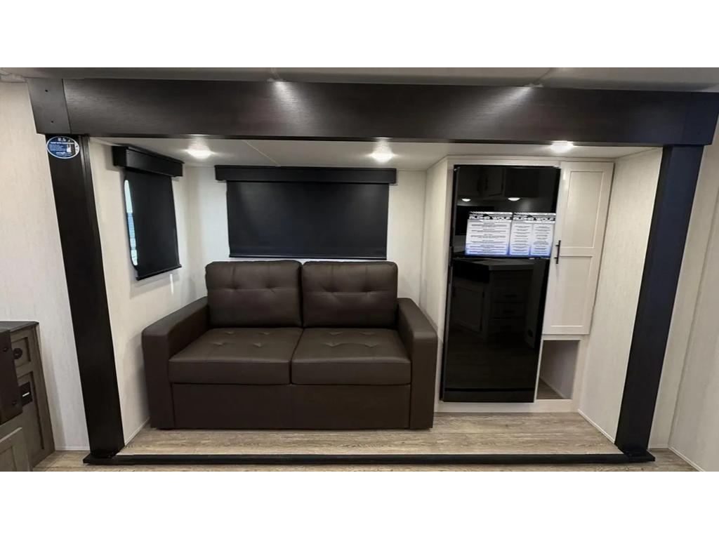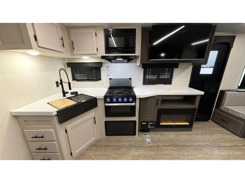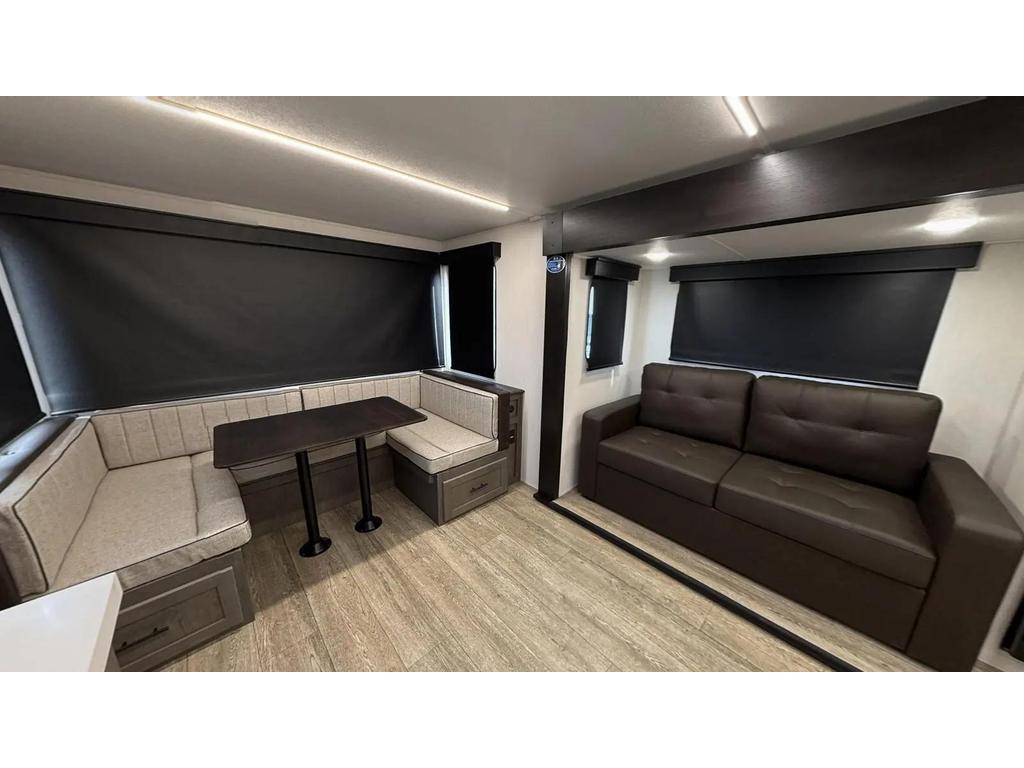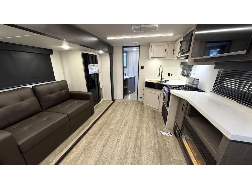 Moins de 10,8 m et significativement spacieuce ! L'Alpha Wolf 2500RL de Forest River se distingue par son espace de séjour et sa cuisine à aire ouverte,