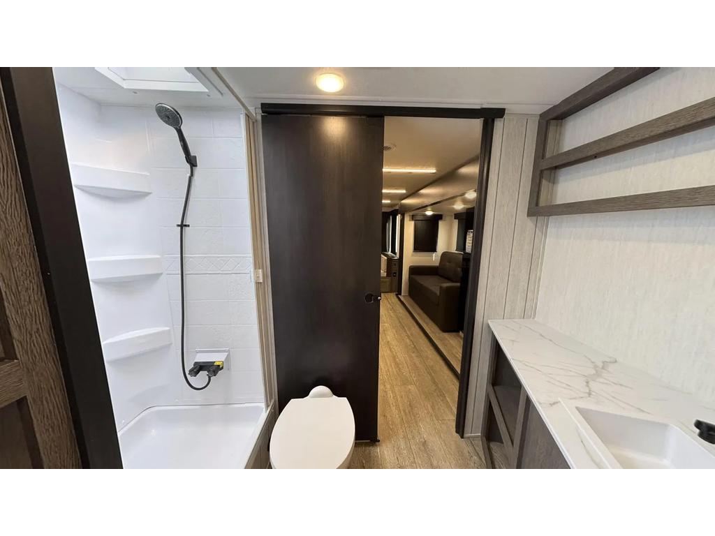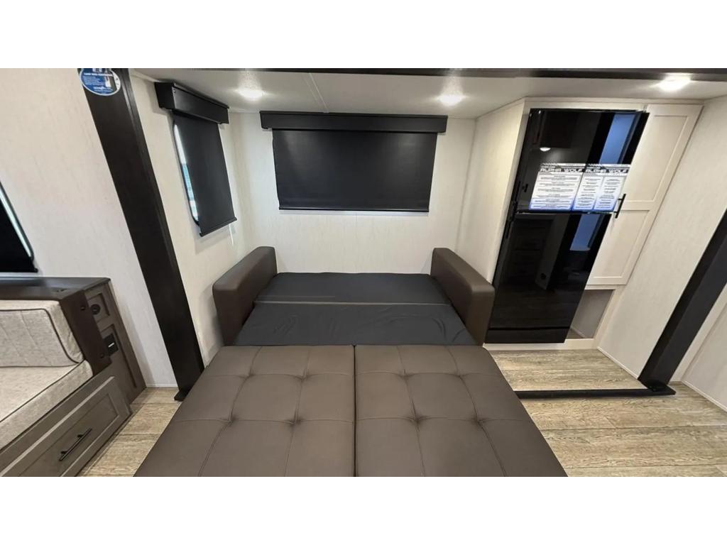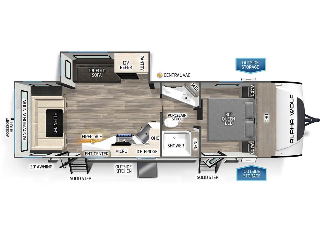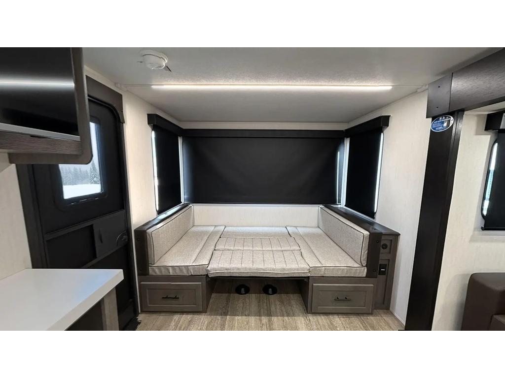 Moins de 10,8 m et significativement spacieuce ! L'Alpha Wolf 2500RL de Forest River se distingue par son espace de séjour et sa cuisine à aire ouverte,