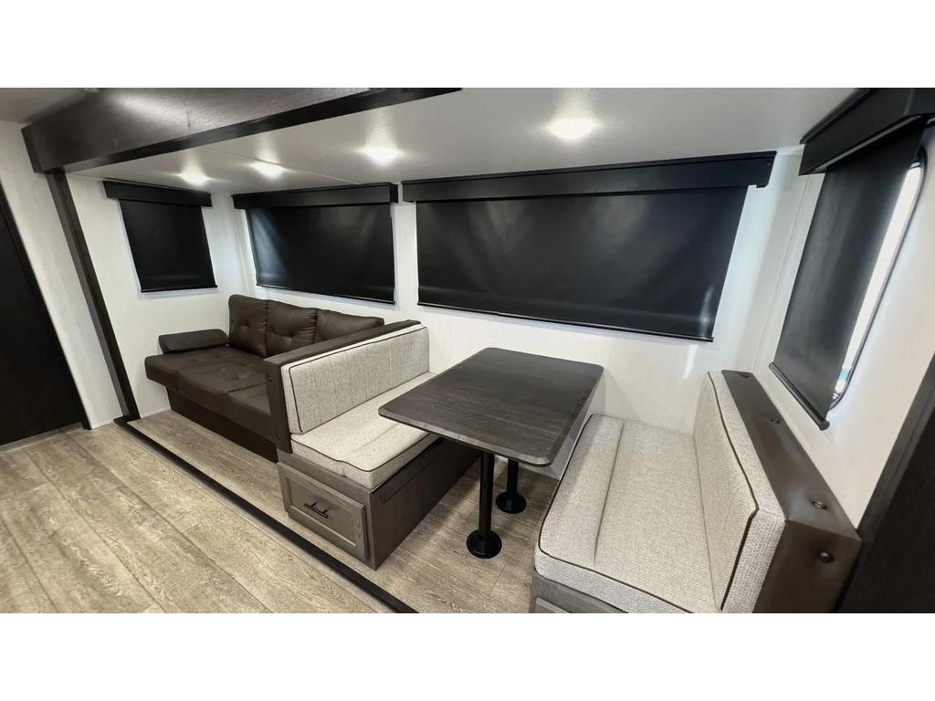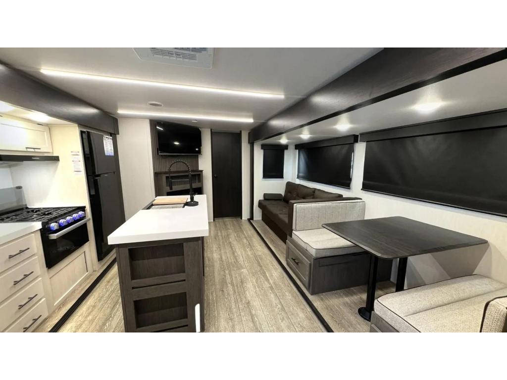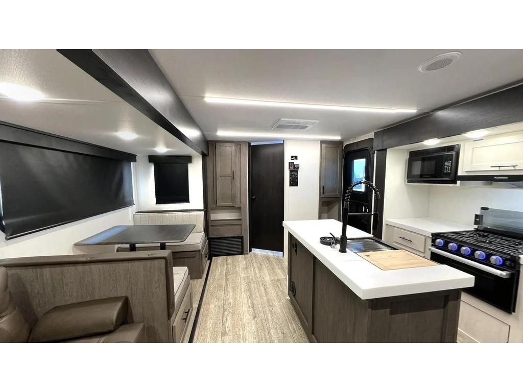 Profitez de la cuisine insulaire bien pensée avec un réfrigérateur, un four et un micro-ondes de 12 volts. Le canapé du salon et le coin repas servent tous deux de couchage supplémentaire