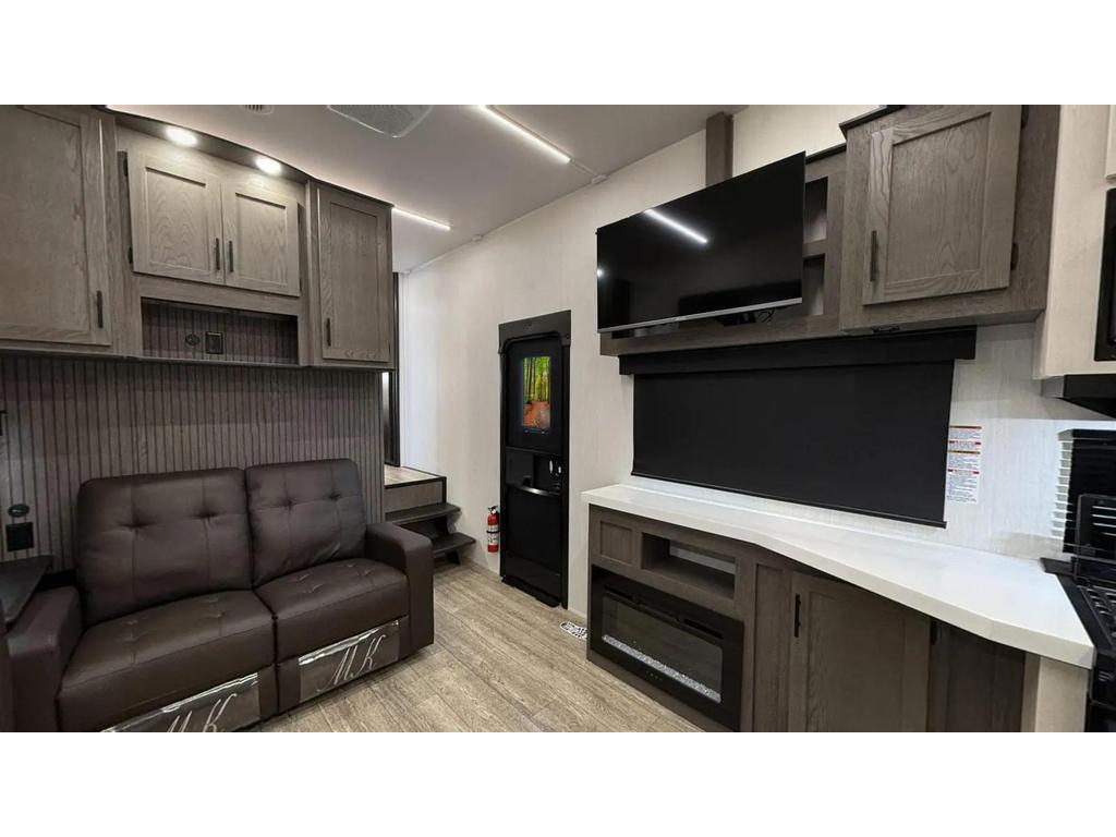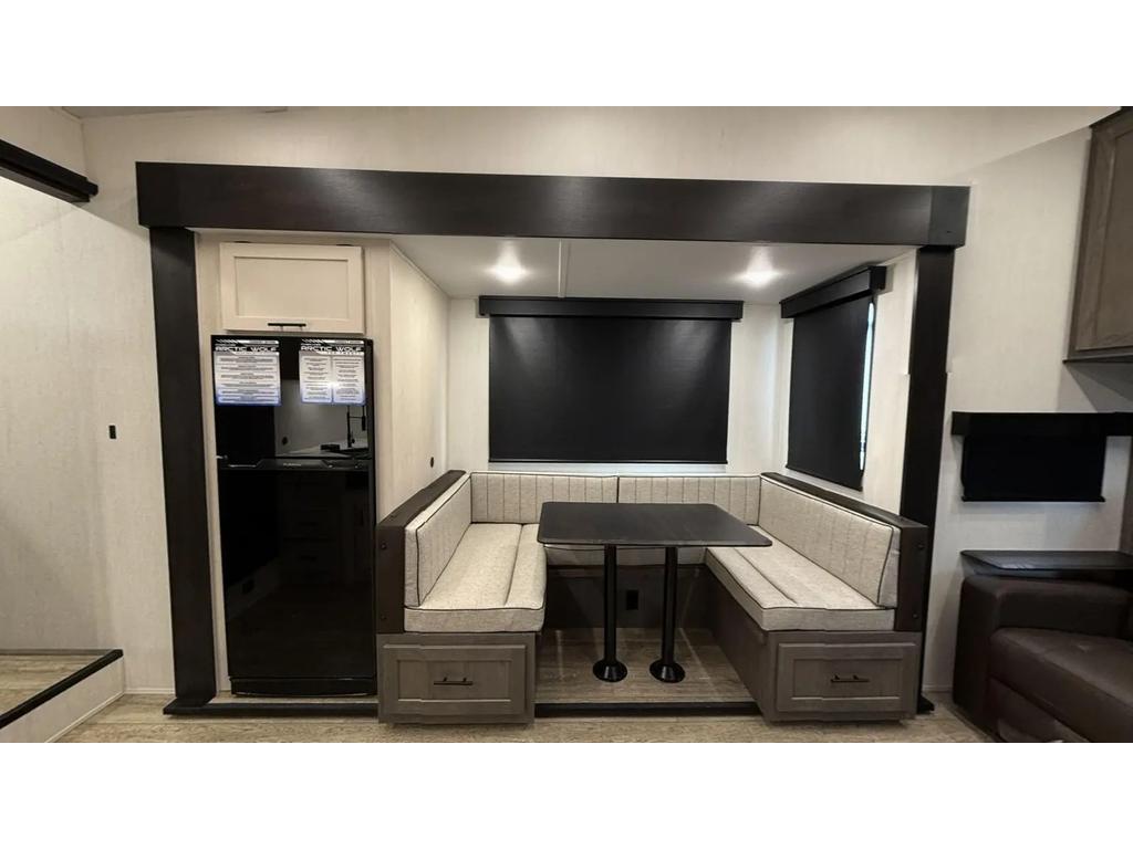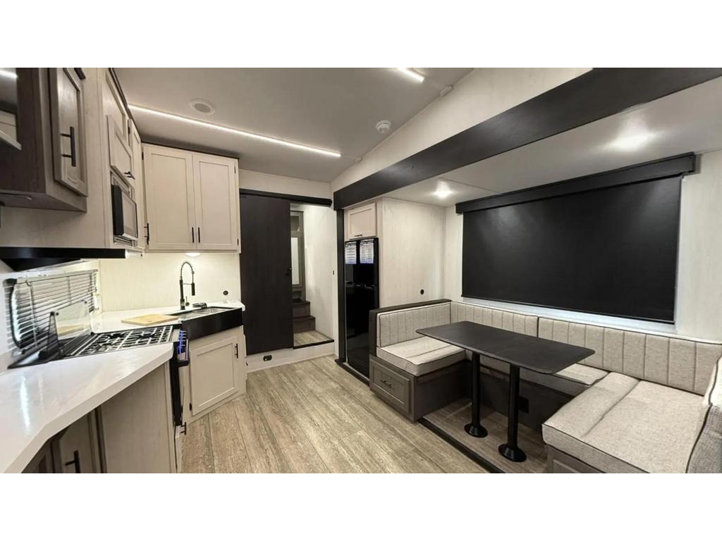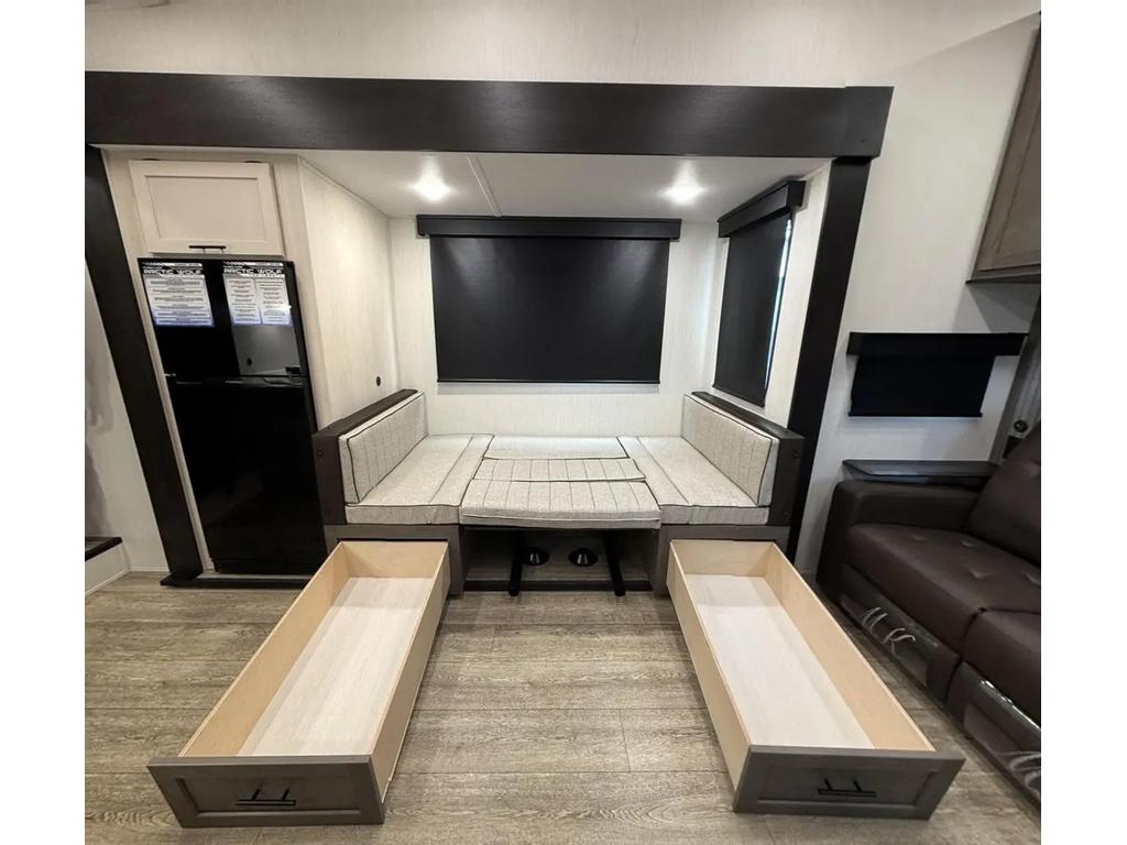 Les points forts de l'intérieur comprennent des sièges de cinéma moelleux avec massage par la chaleur et la lumière, une grande dinette en U qui se transforme en espace de couchage supplémentaire,