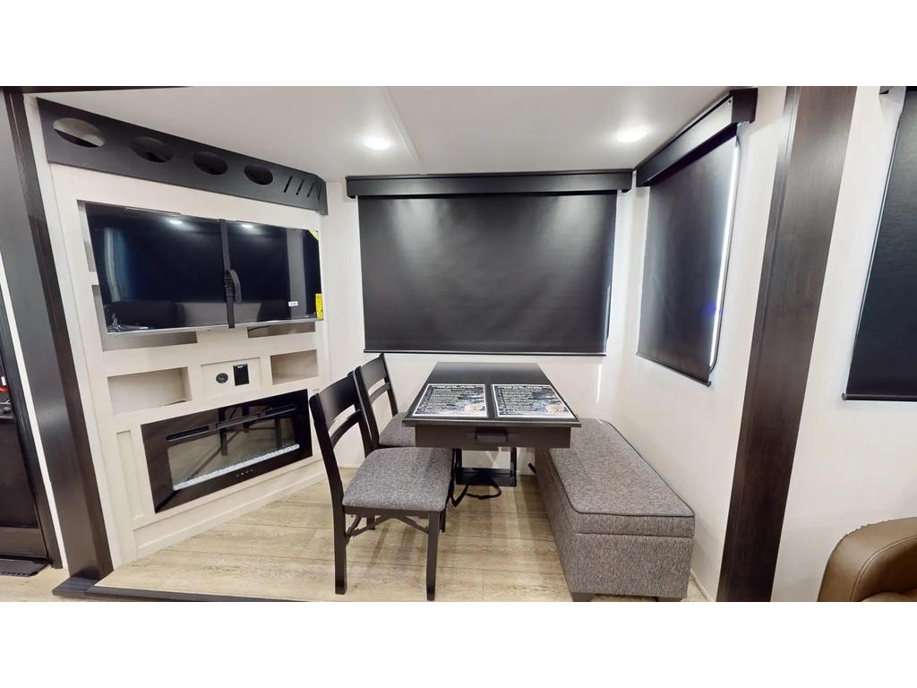 une table autoportante avec chaises et siège ottoman de rangement, un foyer électrique, une tringle de douche amovible pour le séchage à l'air libre,