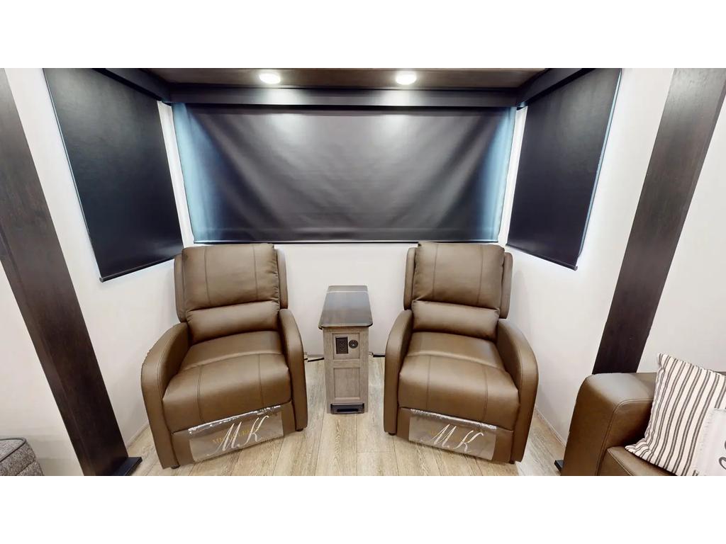 Les points forts de l'intérieur comprennent un casier à vin pratique, deux fauteuils inclinables relaxants,