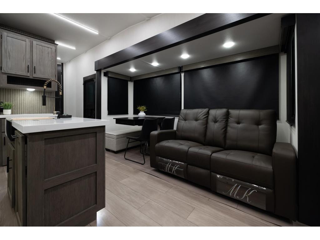 Le salon arrière est entouré de grandes fenêtres qui laissent entrer une abondante lumière naturelle, et le centre de divertissement fait également office de garde-manger dissimulé.