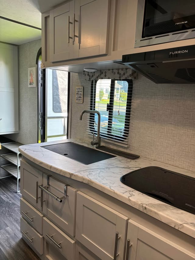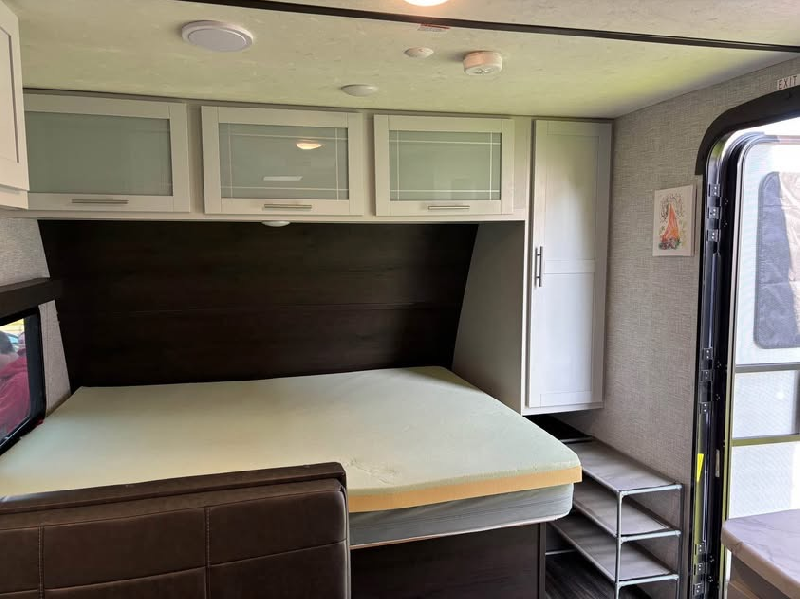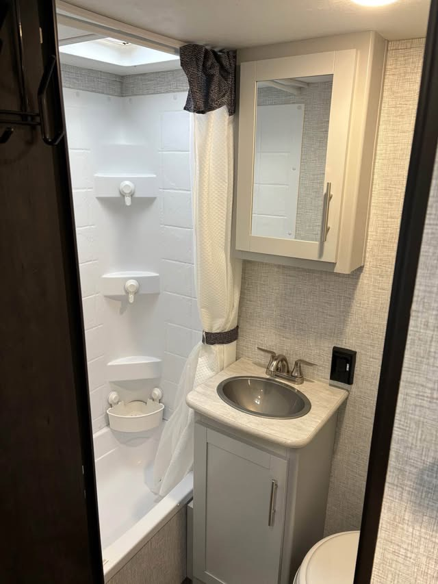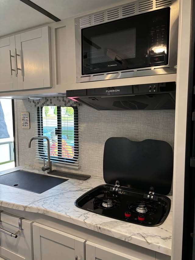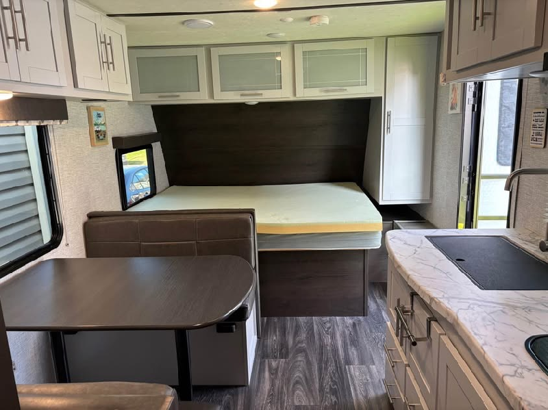 Poids : 3 541 lbs. Longueur : 17 pieds (intérieur) 21 pieds (incluant la pôle) Hauteur : 10.5 pieds Largeur : 8 pieds Couche 6 personnes : lit queen avec surmatelas en mousse, lits superposés simples avec échelle et banquette du coin repas se transformant en lit double. Air climatisé : 13 500 BTU Groupe électrique : Vérin, stabilisateurs et auvent avec éclairage DEL. Radio AM/FM, AUX, USB, Bluetooth avec haut-parleurs intérieur et extérieur. Cuisine : très grand évier profond avec planche à découper pour couvrir, poêle au propane deux ronds à dessus vitré, micro-ondes, réfrigérateur (électrique ou propane) et congélateur 8 pi.cu. Salle de bain : bain douche avec pommeau Oxygenics (bain pour bébé!), meuble lavabo, pharmacie, toilette. Réservoirs : eau fraîche 37 galons, eaux grises 30 galons, eaux noires 30 galons. Propane : 2 réservoirs 20 lbs Chauffe-eau : électrique Construction en aluminium, revêtement en fibre de verre. Douchette extérieure Un seul propriétaire, non-fumeur.
