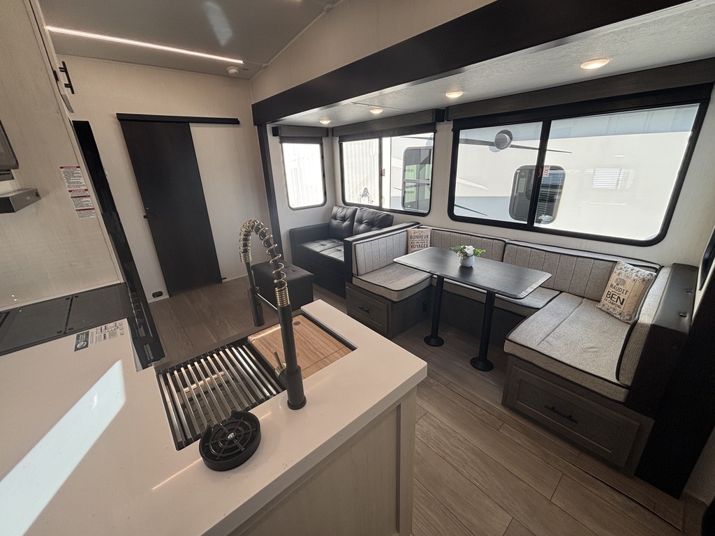 ARCTIC WOLF 285OPT 2026 ROULOTTE À SELLETTE AVEC UN POIDS DE 8500 LIVRES INTÉRIEUR - Cuisine très vaste de couleurs pâles avec évier double, cuisinière avec dessus vitrée, micro-ondes et grand réfrigérateur - Grande banquette en U qui se transforme en lit - Causeuse en cuir devant téléviseur et foyer électrique qui se transforme également en lit - Chambre pour enfants ou invités à l'arrière avec grand lit et rangement - Chambre des maîtres à l'avant avec grand lit et rangement tout autour - Salle de bain centrale avec belle vanité et douche vitrée - Système d'aspiration pour ramasser la poussière EXTÉRIEUR: - Auvent électrique - Marches ultra robustes - Cuisinière extérieur - Coffres de rangement photos à titre indicatif