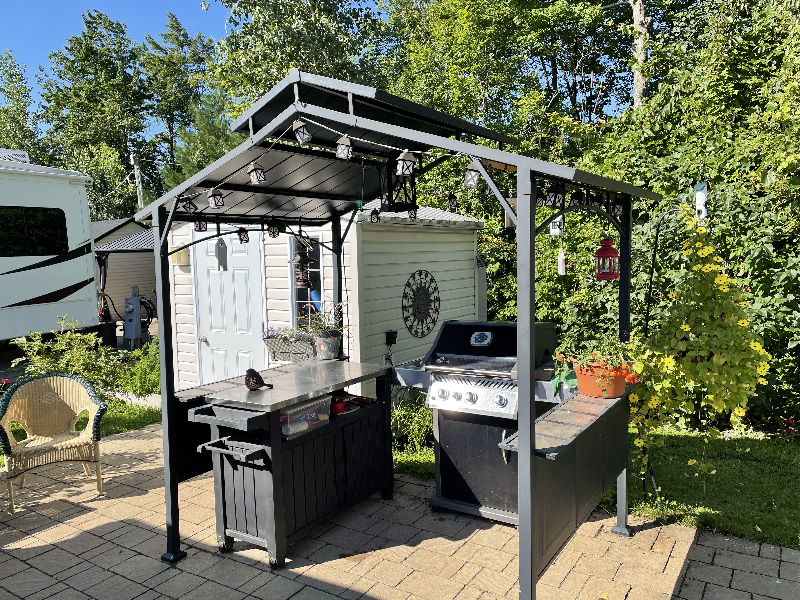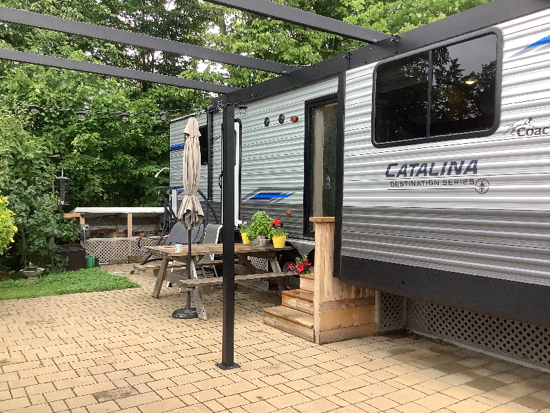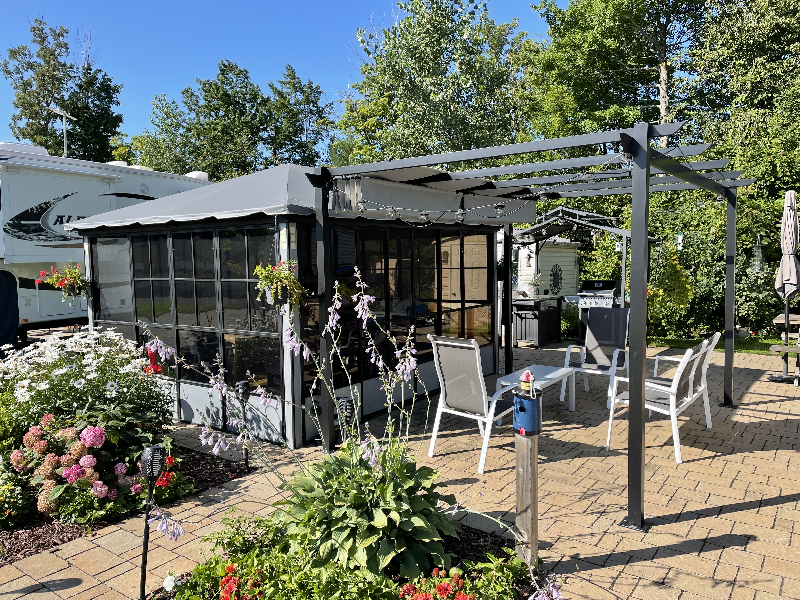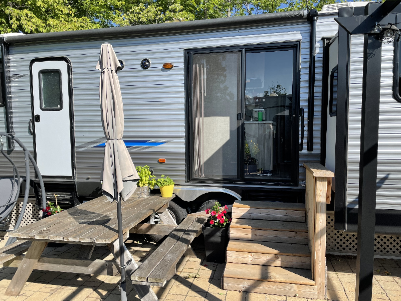 Installée au Camping La Clé des Champs Complexe VR avec possibilité d?acheter le terrain (165 000 $). Inclus avec la roulotte : auvent électrique de 15 pieds, télé de 42 pouces, laveuse à linge, montée sur blocs de béton, treillis camouflant le dessous, aspirateur, antenne nano wi-fi et router, four grille-pain, matelas king de dimensions résidentielles, douche parapluie, table de pique-nique en cèdre. Inclus avec le terrain : ouvert 7 mois d?avril à octobre, connexion wi-fi gratuite, boutique d?accueil, clubhouse, piscine, jeux aquatiques, parc pour enfants, pickleball, pétanque, fers, parc à chiens, remplissage de gaz propane sur place, service de loisirs (cours divers. Cabanon 7? x 8? avec sécheuse Outils et mangeoires Abri pour bbq et comptoir-rangement Remise en plastique et grands bacs de remisage Abri-soleil avec toile Balancelle pour trois Gazébo 10? x 12? Balançoire avec table pour 4 Pit à feu, coin potager et systèmes d?éclairage