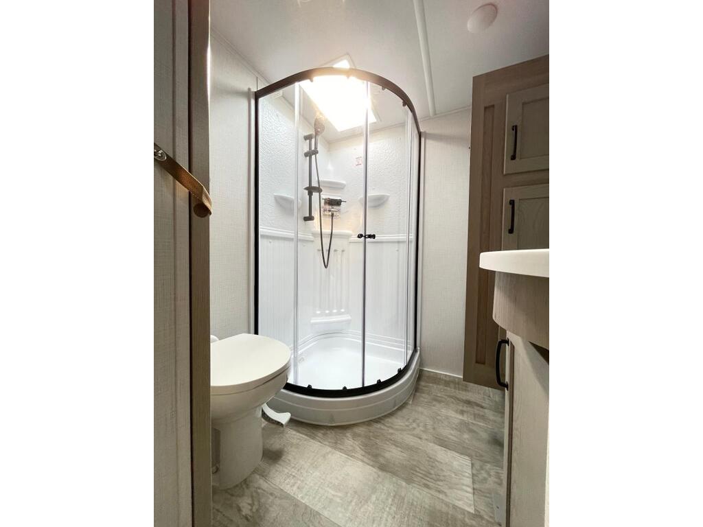Options : Réservoir de propane, Climatiseur au plafond, Ventilateur au plafond, Douche, Toilette, Lit queen-size, Canapé-lit, Prise électrique, Détecteur LPG/CO2, Téléviseur, Chaine stéréo, Prise cable, Antenne pour téléviseur, Micro-onde, Cuisinière, Four, Hotte, Fourneau, Auvent, Chauffe-eau