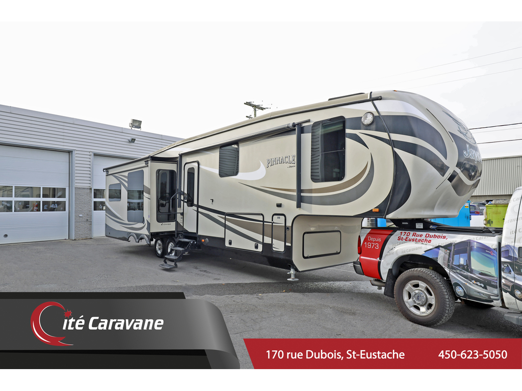 Liquidation fin de saison !! 44 888$ !! Prix reg 49 900$ !! WOW Jayco Pinnacle 36 KPTS 3 extensions avec un poids de 11 895 LBS. Embarquer dans la série la plus haute gamme de Jayco, vous allez apercevoir un immense ilot central avec un comptoir deluxe, frigo de style résidentiel, un four avec 3 ronds en stainless, un évier double en Stainless, lumière au leds dans le coup pieds, un grand garde-manger. Soyez confortable autour du foyer avec deux causeuse amovible et un sofa, immense télévision, table avec 4 chaises, toile de fenêtres de style roller shades, deux airs climatiser centrale, système de chauffage central, inverter afin de rouler de frigo sur la route, salle de bain complet avec une grande douche avec porte en vitre. Dans la chambre des maitres, vous allez avoir un kit King avec du rangement a profusion. Faite le tour a l’extérieur de cette fithwheel pour remarquer un coffre bord en bord, 6 crics stabilisateur, 2 bonbonne de propane, belle grande auvent électrique, slide toper sur les extensions, hautparleurs extérieur, hitch arrière 2’’ et encore plus! 605$/MOIS + taxes ! www.citecaravane.com 450-623-5050 170 RUE DUBOIS , ST-EUSTACHE, SUR LE BORD DE LA 640! UNE ENTREPRISE FAMILIALE A VOTRE SERVICE DEPUIS 1973 ! , DÉPOSITAIRE NUMÉRO 1 FOREST RIVER SUNSEEKER ! LE SPÉCIALISTE DU VR AU QUÉBEC !------------------------------------------------------------------------------------------------------------------------------ Jayco Pinnacle 36 KPTS 3 slide out with a weight of 11,895 LBS. Step inside Jayco's highest range series, you will see a huge central island with solide surface counter, residential style fridge, an stainless oven with 3 cooktop, a double stainless sink, LED light in the footwell, a large pantry. Be comfortable around the fireplace with two removable loveseats and a sofa, huge television, table with 4 chairs, roller shades, two central air conditioning, central heating system, inverter to roll the fridge on the road, complet bathroom with a large shower with glass door. In the master bedroom, you will have a King size bed with plenty of storage. Take a tour around the outside of this fithwheel to notice an huge trunk storage, 6 stabilizing jacks, 2 propane tanks, beautiful large electric awning, slide topper on the extensions, exterior speakers, 2” rear hitch and even more! 605$/MONTH + taxes! www.citecaravane.com 450-623-5050 170 RUE DUBOIS, ST-EUSTACHE, ON THE EDGE OF THE 640! A FAMILY BUSINESS AT YOUR SERVICE SINCE 1973! , DEPOSITORY NUMBER 1 FOREST RIVER SUNSEEKER! THE RV SPECIALIST IN QUEBEC!