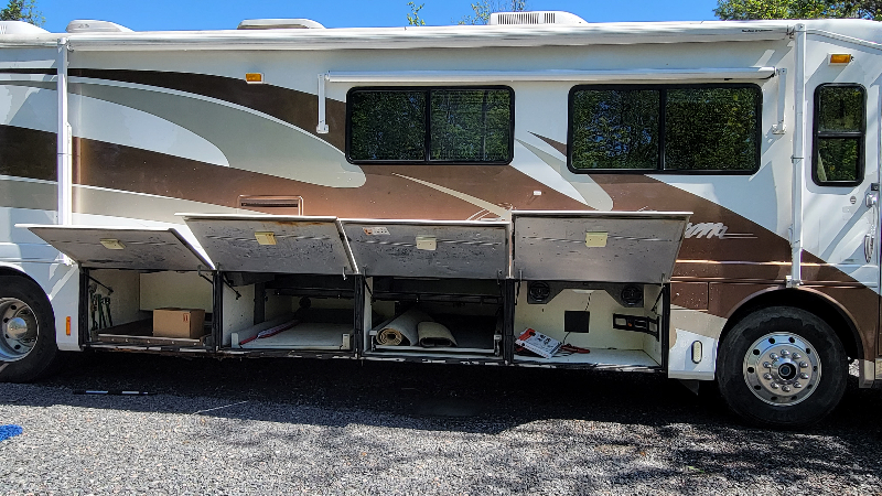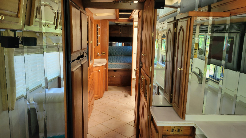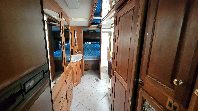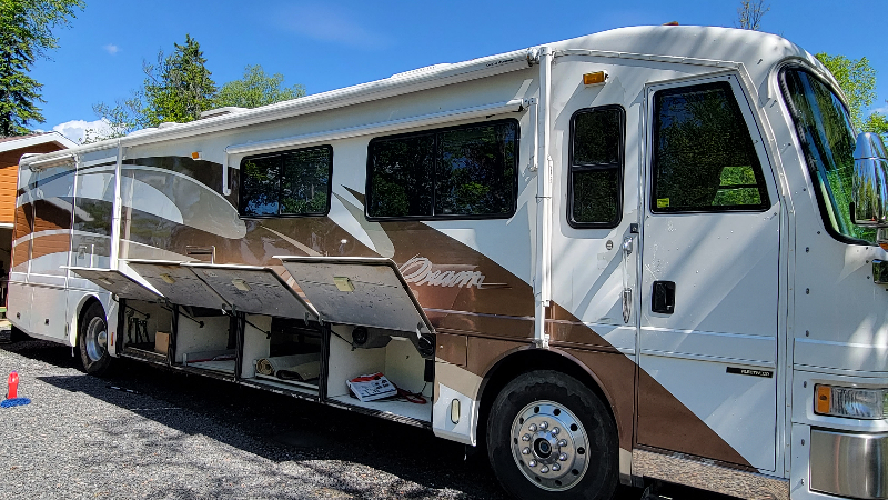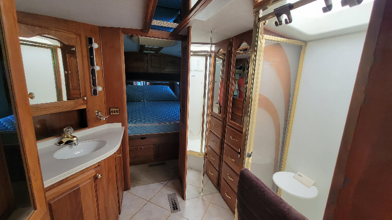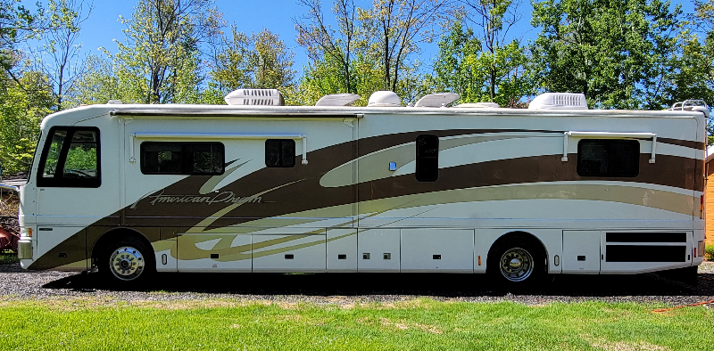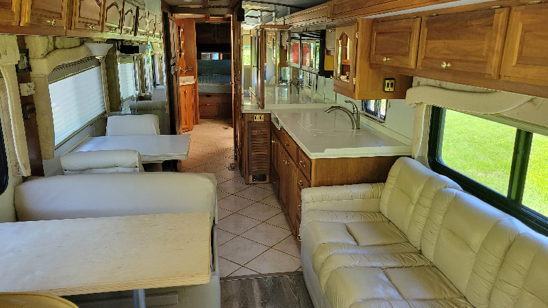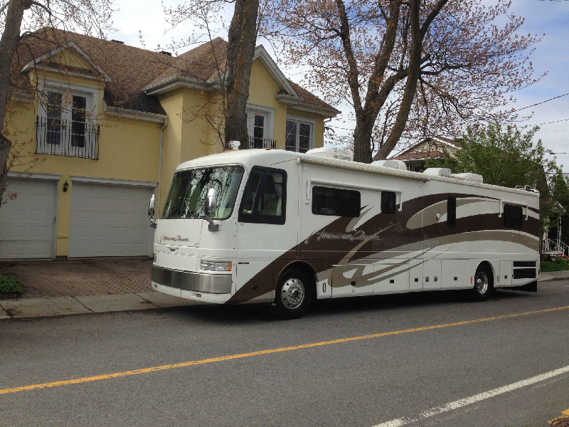 2000 Fleetwood American Dreams 40ft , Moteur Cummins ISC 330 HP Allison Transmission automatique 6 vitesses 2 Slider , 2 unités A/C 2 fournaises à gaz Cuisinière à gaz 3 brûleurs avec four Micro/four à convection Canapé en cuir style (jack. Nife ) Lit Queen Immense garde-robe coulissante en cèdre placard système surround souds Bose. Unité combinée laveuse/sécheuse, 7,5 kw Générateur diesel silencieux Onan .90 000 milles de parcourue sur le VR .125 gal de carburant 100 gal. Eau 60 gal. Eau grise 40 gal. Eau noire 40 gal. Réservoir 10 gal d?eau chaude au propane et électriques. Commode en porcelaine Comptoirs en Corian Système de caméra de recul et Téléviseur à écran plat dans chambre.