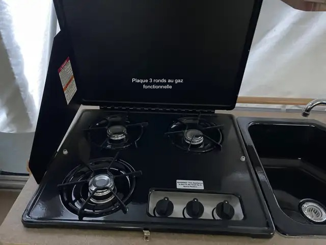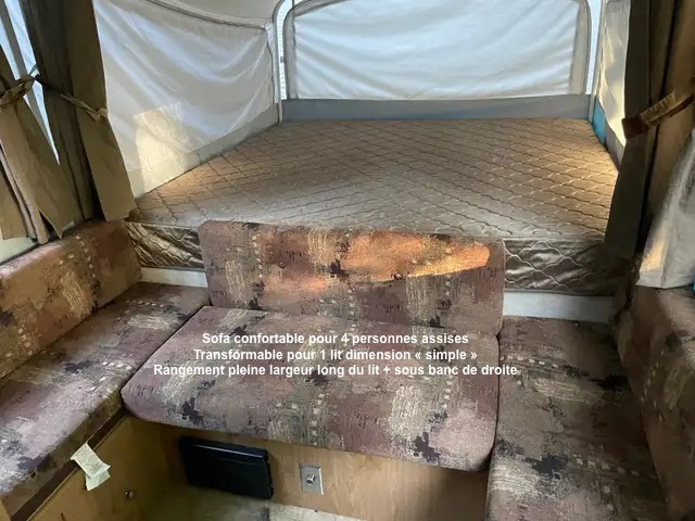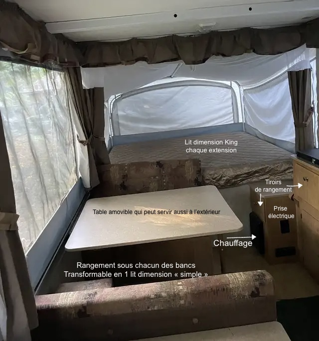 Une tente roulotte spacieuse et confortable ! 12 pi plancher, 25 pi (lits ouverts) Poids 2,300 livres Lits King (2) + 2 banquettes = 6@8 pers Chauffage (gaz) Table à dîner / 4 personnes Espace à dîner transformable / 1 lit simple Extension extérieure / derrière plaque chauffante Plaque chauffante intérieure au gaz, 3 ronds Réservoir eau chaude (gaz) + froide Réfrigérateur (gaz, électricité, 12volts) Sofa 4 places confortables (transformable 1 lit simple) Pommeau pour douche extérieure Poêle extérieur, 2 ronds avec connexion gaz Auvent 8?x12? Roue de secours TOUS les appareils fonctionnent très bien VENDUS AVEC LA TENTE ROULOTTE : *Support pour 4 vélos sur toit (dont 1 pour vélo assistance électrique) *Barres de torsions