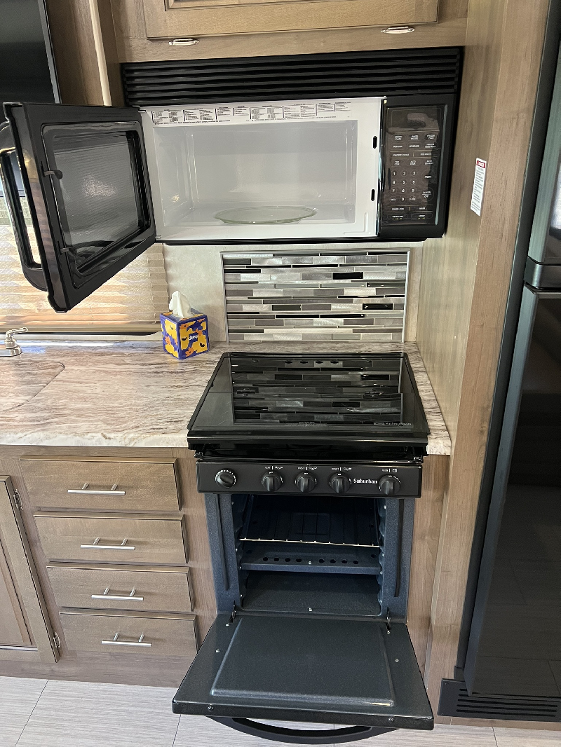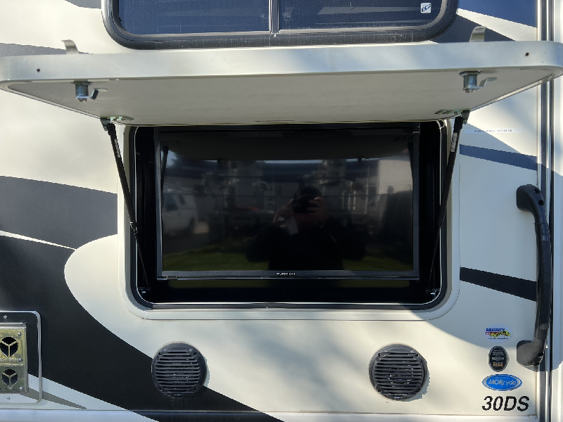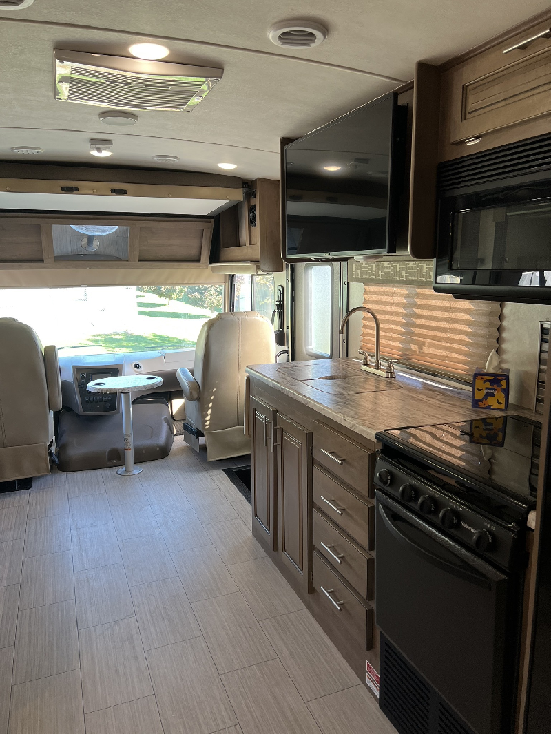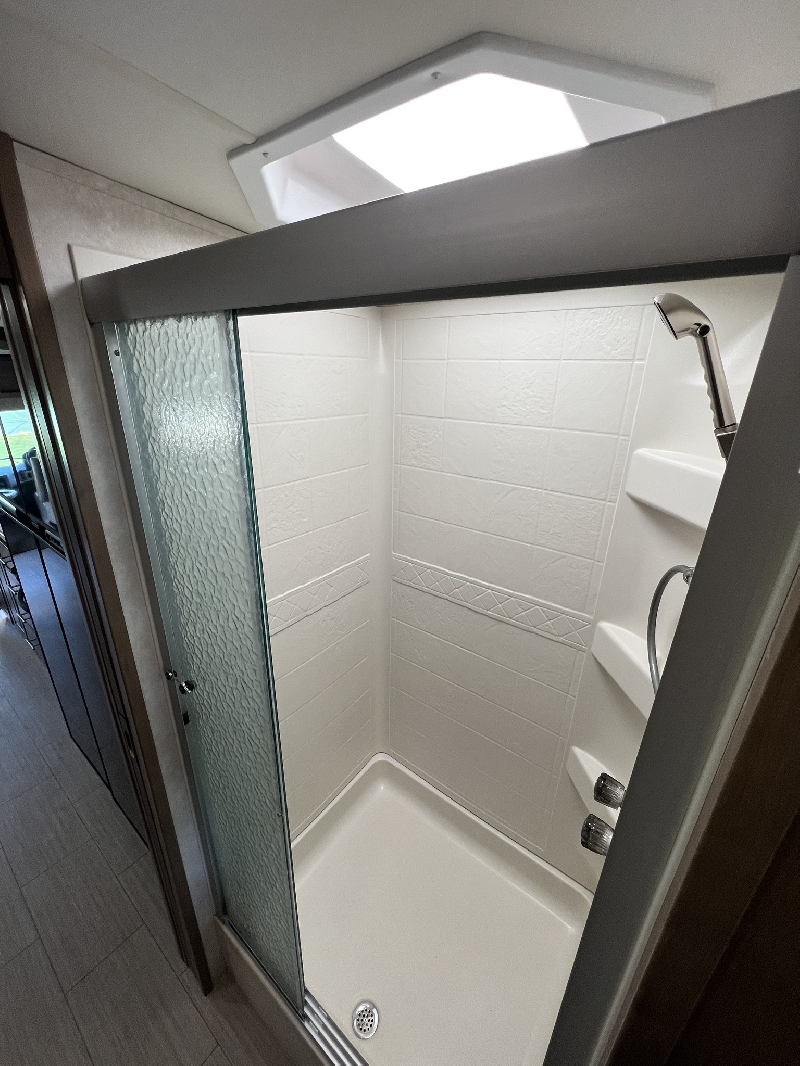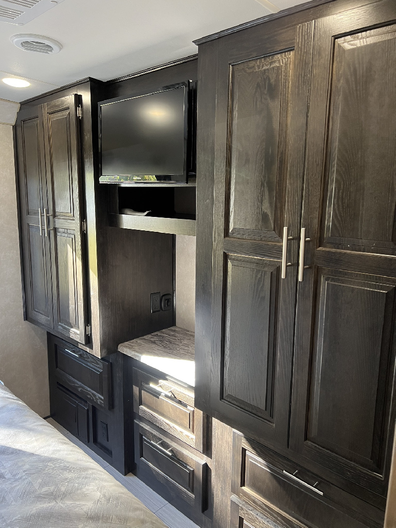 Carburant: Essence, Couleur extérieure: Beige,Longueur: 31.7 pieds,Extension: 2,Couche: 8 Système de repérage TAG intégré, congélateur propane / électrique 2 portes, Réfrigérateur propane / électrique 2 portes, attache-remorque, caméra de recul, divan-lit (grandeur double), 1 climatiseur de 18,000 BTU (thermopompe) dans la cuisine et 1 climatiseur 15,000 BTU dans la chambre, cric hydraulique, cuisinière au propane avec hotte et four, four micro-ondes, chauffe-eau électrique/propane, douche intérieure spacieuse séparée de la salle de bain, génératrice à essence, lit escamotable avant électrique, chambre principal avec Lit grandeur King et deux grands garde-robe (dont 1 déjà préparé pour accommoder l?installation de laveuse/sécheuse), miroirs électriques, régulateur de vitesse, 3 Téléviseurs, Housse de protection hivernal (valeur 800$),Stabilisateur de conduite Safe T plus (valeur 1,800$) Système de vérification de la pression des Pneus (valeur 980$)