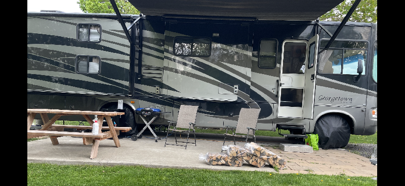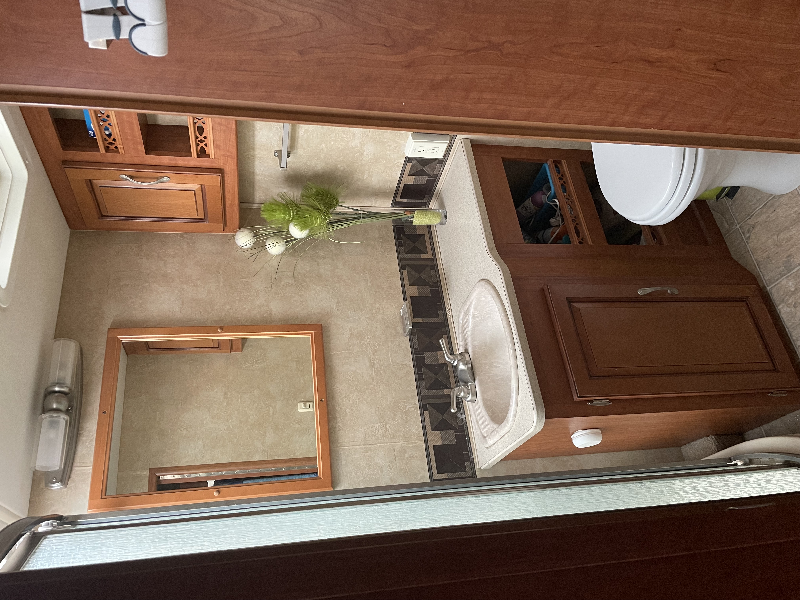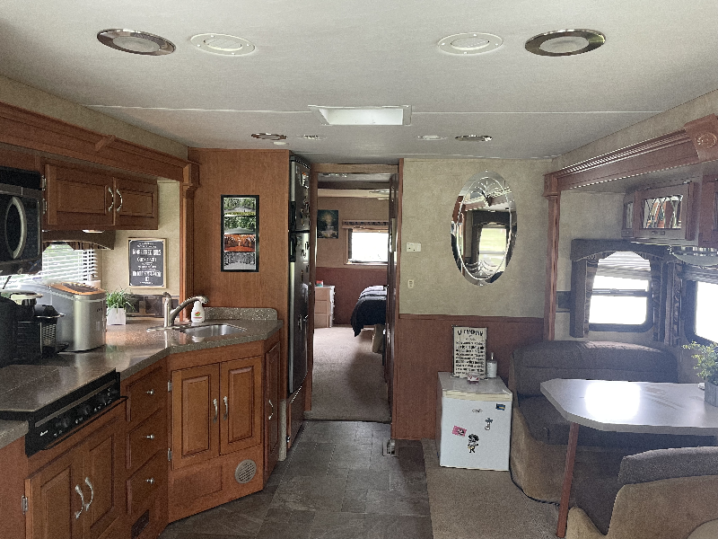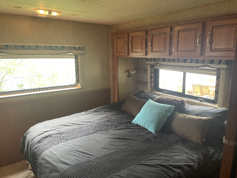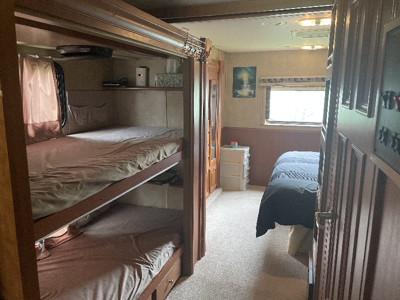 VR modèle 357QS full paint avec lits superposés (bunk beds). Il a 33000 miles au compteur et mesure 37 pieds. Cette unité munie de 4 extensions est très bien équipé : elle offre une cuisine avec de beaux comptoirs de style Corian, une salle de bain avec une douche en coin vitrée, lit queen dans la salle à couchée arrière, etc. Ce VR couche 7 personnes grâce à ses lits superposés et à son divan de cuir de style « hide-a-bed ». Il est chaussé sur des pneus 22,5 pouces qui sont sur ses jantes Alcoa. Il offre également les équipements suivants : auvent électrique, génératrice Oman 5500W, niveleuse hydraulique, caméra de recul et sièges électriques.
