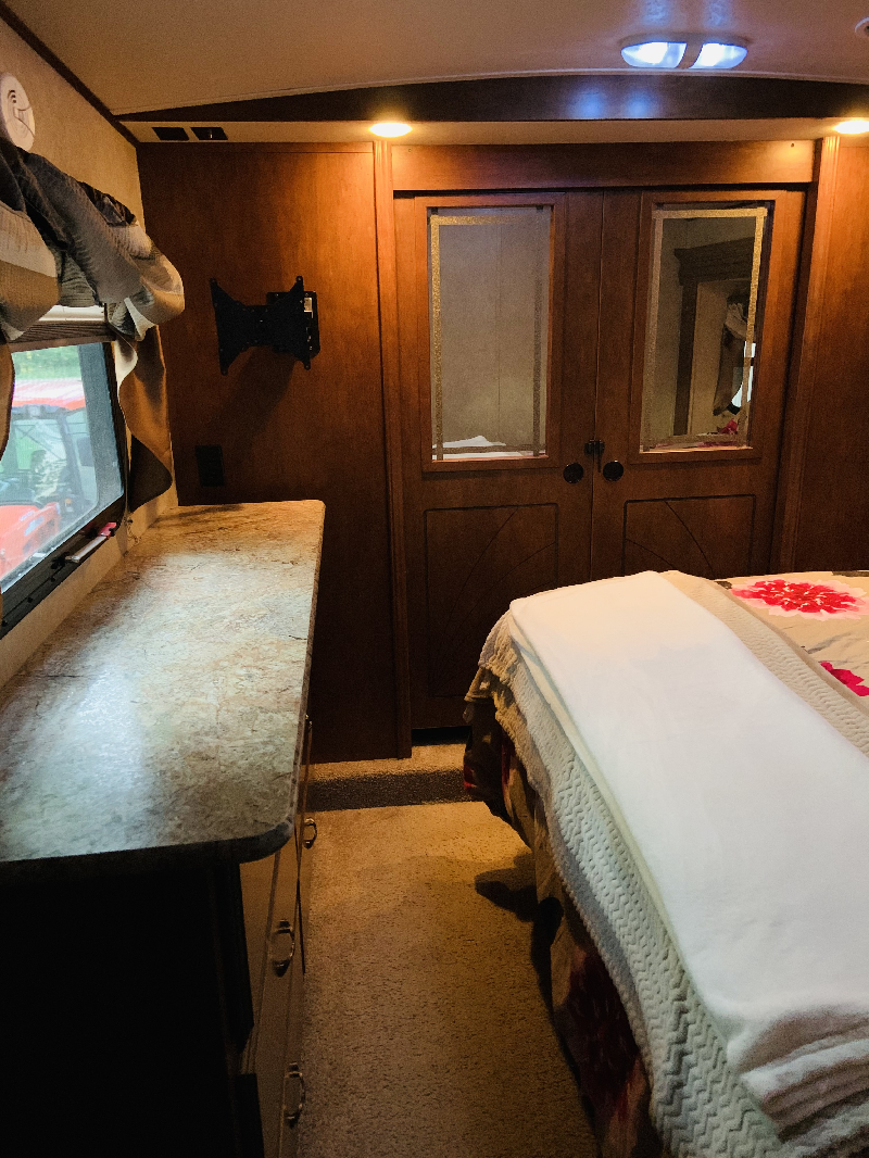 Fifth Wheel Heritage Glen 2015. Modèle 266rlbs. Chambre fermée, lit queen. 2 extensions. Divan lit. Climatisation, balayeuse centrale. Foyer électrique, télévision. Beaucoup de rangement. Auvent électrique.