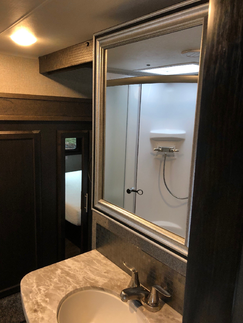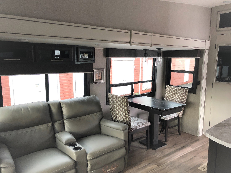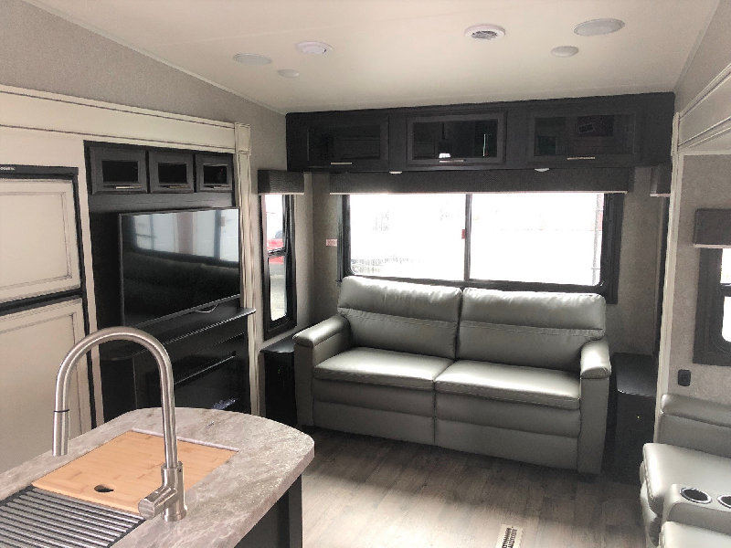 Modèle 28.5RSTS. Longueur de 32'-8". Largeur de 8'. Poids à vide de 9150 lbs. Capacité Cargo de 1845 lbs. Décoration Modern Farmhouse. Couche jusqu'à 6 personnes. 1 lit queen. 1 sofa-lit queen. 2 fauteuils cinéma. Télé LED 40". Foyer électrique. Table avec 4 chaises. Chauffe-eau électrique et gaz. Frigo 8 pieds cube avec congélateur. Salle de bain complète avec douche. Toilette en porcelaine Fournaise 32000 BTU. Climatiseur 15000 BTU. Entrée 50 AMP. Pneus de 16 pouces. Auto-nivellement. Auvent rétractable. Cuisine extérieure. 2 bonbonnes de 30 lbs. JAYCOMMAND. Système de caméras intégrées. Système de surveillance de pression des pneus. 2 réservoirs d'eau grise. 1 réservoir d'eau noire. Garanties supplémentaires. Liste complète d'équipement sur demande.
