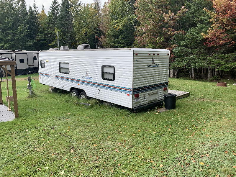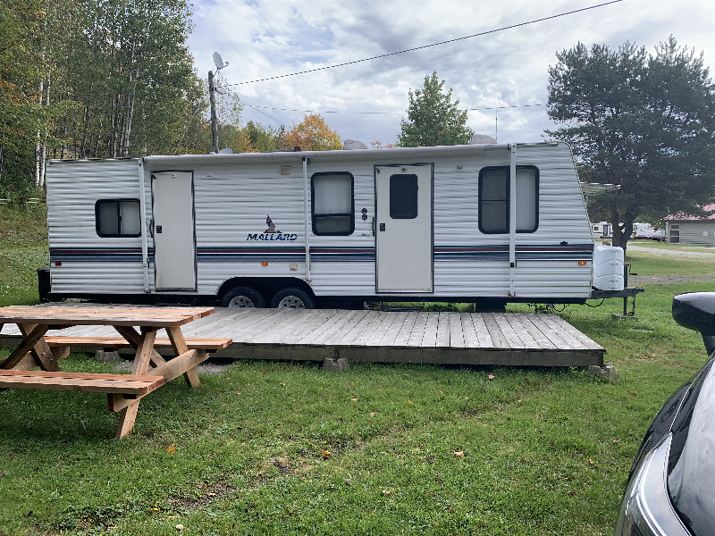 Roulotte située sur le terrain du Camping Station touristique Baie-des-Sables au Lac-Mégantic en Estrie. Emplacement : terrain #32 dans la Boucle P.Bédard (terrain discret à côté de la forêt) À 2 minutes de marche de la plage Baie-des-Sables du Lac-Mégantic. Le terrain #32 est aussi à 30 secondes d?une piscine creusée privée (chauffée). Cette piscine est pour les campeurs de la boucle P.Bédard et pour la boucle D.Morrison. Seulement 45 roulottes ont accès à la piscine privée. Roulotte Mallard année : 1996 très très propre (voir photos) Longueur : 30 pieds sur pôle Toit en tôle d?origine (jamais coulé). Poêle 3 ronds et four au propane. Fournaise centrale au propane. Frigo électrique et aussi au propane. Auventde 2 étés. Une chambre fermée Couche 6 personnes (divan lit et table qui fait un lit). Tank à eau chaude au propane. Patio en bois traité (8 pieds x 20 pieds) Cabanon en tôle Inclus : BBQ au propane, ensemble patio (table + 4 chaises)