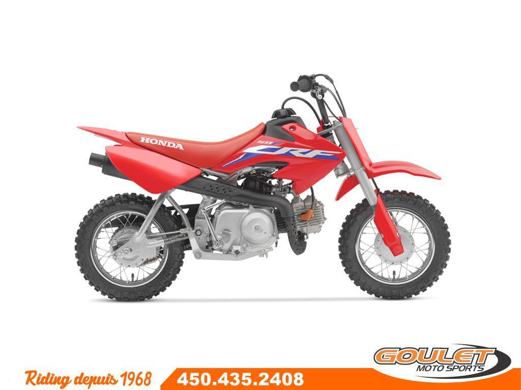 HONDA CRF 50F 2022 \*\*\* Pour seulement 2199$ Valeur de 2649$ - Moto Neuve - Garantie Honda complète \*\*\* Petite mais redoutable, la Honda CRF50F 2022 est la porte d'entrée parfaite dans l'univers de la moto tout-terrain. Grâce à sa hauteur de selle basse, son moteur fiable et sa transmission à 3 vitesses avec embrayage automatique, elle est idéale pour les jeunes pilotes qui débutent en toute confiance. - Moteur monocylindre 49cc à 4 temps, refroidi par air - Démarreur à kick fiable et facile à utiliser - Transmission à 3 vitesses avec embrayage automatique - Hauteur de selle de seulement 548 mm (21,6 po) pour un meilleur contrôle - Suspension avant télescopique et monoamortisseur arrière pour plus de confort Cette unité est chez Goulet Moto Sports de Ste-Thérèse. Téléphonez au 450.435.2408 Possibilité de financement avec plusieurs institutions financières. 2? chance au crédit disponible. Goulet Moto Sports est votre concessionnaire moto depuis 1968. Fier représentant officiel des marques HONDA, APRILIA, MOTO GUZZI, VESPA, PIAGGIO, KTM, NIU, SURRON et URAL pour le Grand Montréal. Nous avons un énorme choix de motos usagées inspectées par nos professionnels. 2 adresses pour vous servir : Sainte-Thérèse (450.435.2408) et Saint-Jérôme (450.431.6622). Goulet Moto Sports ne peut être tenu responsable d'une omission, d'un délai ou d'une erreur de transcription de l'information. Le prix affiché reflète la condition de l'unité. Pour différentes raisons, les prix peuvent différer de ceux indiqués en ligne. Les données sont affichées à titre indicatif seulement et ne peuvent être considérées comme une information contractuelle. Nous vous encourageons vivement à nous consulter pour plus de détails avant de vous déplacer. Des frais tels que taxes, immatriculation, administration ou autres peuvent s'appliquer. Essence, 3 vitesses, Système de refroidissement: Refroidi à l'air, 50.0 CC, Garantie: 6 mois ---------------------- 2022 HONDA TRAIL CRF 50R \*\*\* For only $2199 Value of $2649 - New Motorcycle - Full Honda Warranty \*\*\* Small but mighty, the 2022 Honda CRF50F is the perfect entry point into the world of off-road motorcycling. Thanks to its low seat height, reliable engine, and 3-speed transmission with automatic clutch, it's ideal for young riders looking to get started with confidence. - Air-cooled, 49cc, 4-stroke, single-cylinder engine - Reliable and easy-to-use kick starter - 3-speed transmission with automatic clutch - Seat height of only 548 mm (21.6 in) for better control - Telescopic front suspension and single rear shock absorber for greater comfort This unit is available at Goulet Moto Sports in Ste-Thérèse. Call 450.435.2408 Financing available with several financial institutions. Second chance credit available. Goulet Moto Sports has been your motorcycle dealership since 1968. Proud official representative of HONDA, APRILIA, MOTO GUZZI, VESPA, PIAGGIO, KTM, NIU, SURRON, and URAL brands for Greater Montreal. We have a huge selection of used motorcycles inspected by our professionals. 2 locations to serve you: Sainte-Thérèse (450.435.2408) and Saint-Jérôme (450.431.6622). Goulet Moto Sports cannot be held responsible for any omissions, delays, or transcription errors. The price displayed reflects the condition of the unit. For various reasons, prices may differ from those indicated online. The data displayed is for informational purposes only and should not be considered contractual information. We strongly encourage you to contact us for more details before traveling. Fees such as taxes, registration, administration, or others may apply. Gasoline, 3 speeds, Cooling System: Air cooling, 50.0 CC, Warranty: 6 mois