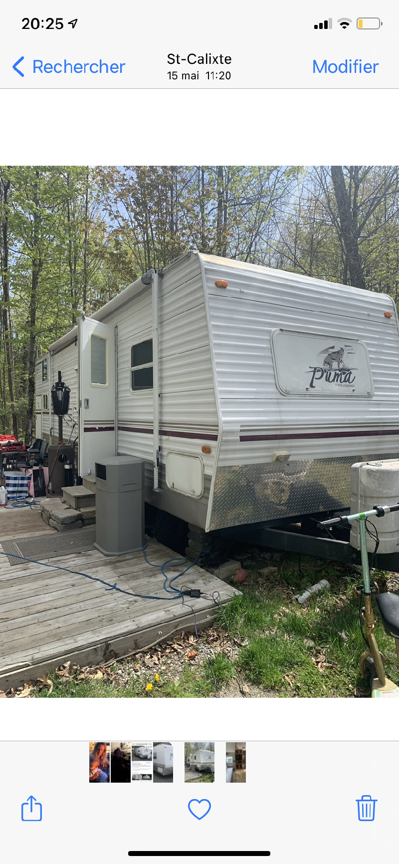 Située au camping Le Circuit de Saint-Calixte cette roulotte est une puma palomino 2007. Elle peut contenir 7 personnes pour coucher. À noter que vous devez être bricoleur car la roulotte a eu un infiltration et le frame de l?extension est à refaire. Le plancher est fait mais il reste le couvre plancher à mettre. Jai tout fait peinturer gris pale les murs et un ton plus foncé de gris les armoires (tout ce qui est brun dans la roulotte) je la vend telle quelle. Vous avez priorité sur la liste d?attente si vous voulez le terrain aussi. 8750$ et elle est à vous.