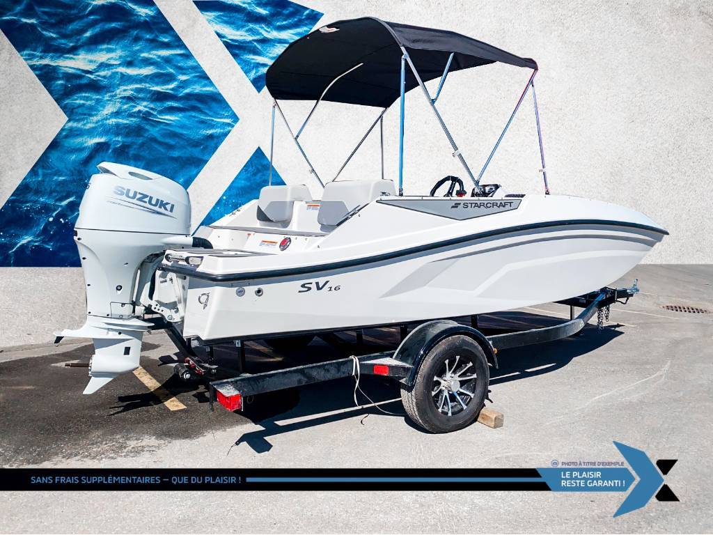 SV 16 OB 75HP deck boat bateau Ponté ?? Starcraft SV 16 OB 2025 – Le Bateau Ponté Polyvalent et Récompensé ! Fraîchement sorti du four, ce nouveau modèle a été conçu pour permettre à tout le monde de profiter de l’eau ! À ce prix-là, on pourrait penser que c’est du vol. Un bateau compact avec un moteur développant une belle performance. À cette taille, vous serez impressionné par son agilité. ?? Caractéristiques principales : ? Moteur Suzuki 75 HP – Puissance et efficacité au rendez-vous. ? ? Capacité : Jusqu’à 6 passagers – Profitez de l’eau en bonne compagnie ! ??????????? ? Moteur maximal 90 HP – Personnalisation de performance selon vos besoins. ?? ? Design primé et élégant – Options de couleurs rehaussées pour un look unique. ?? ? Poids de 1800 lbs – Léger et facile à manœuvrer. ?????? ? Longueur de 16,8 pieds – Parfait pour une expérience compacte sans compromis. ?? ?? Équipements et technologies avancées : ? Lumières de navigation et d’amarrage – Sécurité et visibilité optimales. ?? ? Lumière de courtoisie – Ajoute une touche de luxe à bord. ?? ? Indicateur de trim – Contrôle précis de votre bateau en toute situation. ?? ? Indicateur de vitesse – Pour un suivi facile de votre performance sur l’eau. ?? ?? Système audio premium : ?? Système audio Wet Sound avec radio AM/FM, USB, auxiliaire et Bluetooth – Profitez de votre musique préférée en tout temps ! ?? ? 4 haut-parleurs – Pour une expérience sonore complète et immersive. ?? ?? Confort et équipements supplémentaires : ? Toit bimini – Protection contre le soleil pour des journées parfaites sur l’eau. ?? ? Volant extrême – Pour une prise en main sportive et agréable. ?? ? Toile d’amarrage incluse – Protégez votre bateau facilement. ?? ? Prise 12 volts – Restez connecté et chargez vos appareils. ?? ?? Possibilité d’ajouter une remorque en option : 4 995 $ ?? Ne manquez pas votre chance de naviguer avec style et confort ! Contactez-nous dès aujourd’hui pour plus d’informations ou pour réserver le vôtre. ? La marque Starcraft Marine, chez Groupe Motoplex, offre des pontons et des bateaux stylés, polyvalents et sécuritaires à un excellent rapport qualité prix. Avec plus de 100 ans d’expérience en fabrication de bateau, Starcraft Marine est une marque établie et de confiance. De plus, une garantie à vie limitée plus une garantie complète de six ans assurent la durabilité de votre bateau. GARANTIE PROLONGÉE jusqu'à 4 ans disponible et plan d’entretien Financement approuvé — 1re, 2e et 3e chance au crédit! Testez-nous et trouvez la meilleure solution, au meilleur taux. Votre incontournable du financement ! PLEASE DON'T HESITATE TO CONTACT US, WE SPEAK ENGLISH AS WELL ! Nous prenons tout véhicule d’échange Prix Garanti. AUCUN FRAIS CACHÉS, prix affiché valide sur financement ou paiement comptant. *(taxe en sus) We speak English contact us. LIVRAISON PARTOUT AU Québec Mentions légales au financement, consultez notre site Internet. GARANTIE PROLONGÉE jusqu'à 4 ans disponible et plan d’entretien disponible uniquement chez groupe motoplex