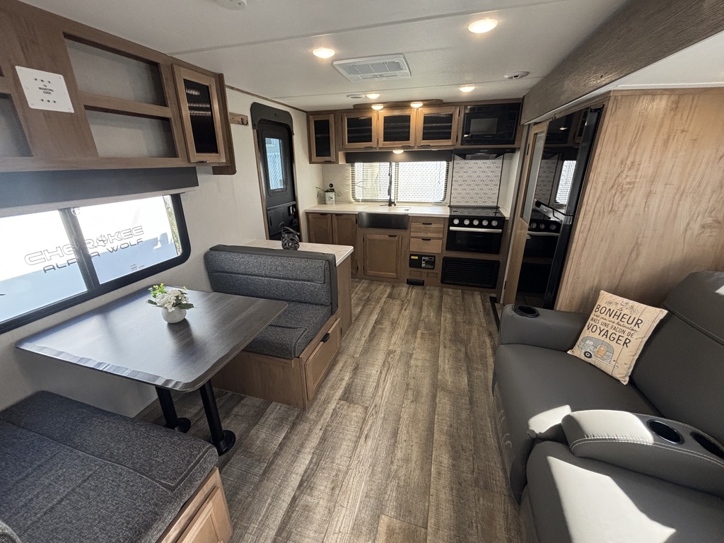 ALPHA WOLF 23LDE 2025. Très belle roulotte pour couple. Elle est complètement équipée avec un poids d'environ 5600 livres. Dans l'extension vous trouverez une causeuse qui se transforme en lit ainsi que le réfrigérateur et un garde-manger. La chambre avant possède un lit queen avec rangement de chaque côté de celui-ci. La chambre est équipée également d'une sortie indépendante communicante sur l'extérieur. La cuisine a beaucoup de commodités tel qu'un grand évier en acier inoxydable, une cuisinière et un réfrigérateur. La banquette en forme de U se transforme en lit supplémentaire La grande salle de bain centrale a une douche vitrée ainsi qu'une belle vanité. Cette roulotte est parfaite pour passer du bon temps à l'extérieur grâce à l'auvent électrique. Elle est munie d'un vérin avant électrique et de marches ultra robustes. Financement facile sur place. **PHOTOS A TITRE INDICATIF**