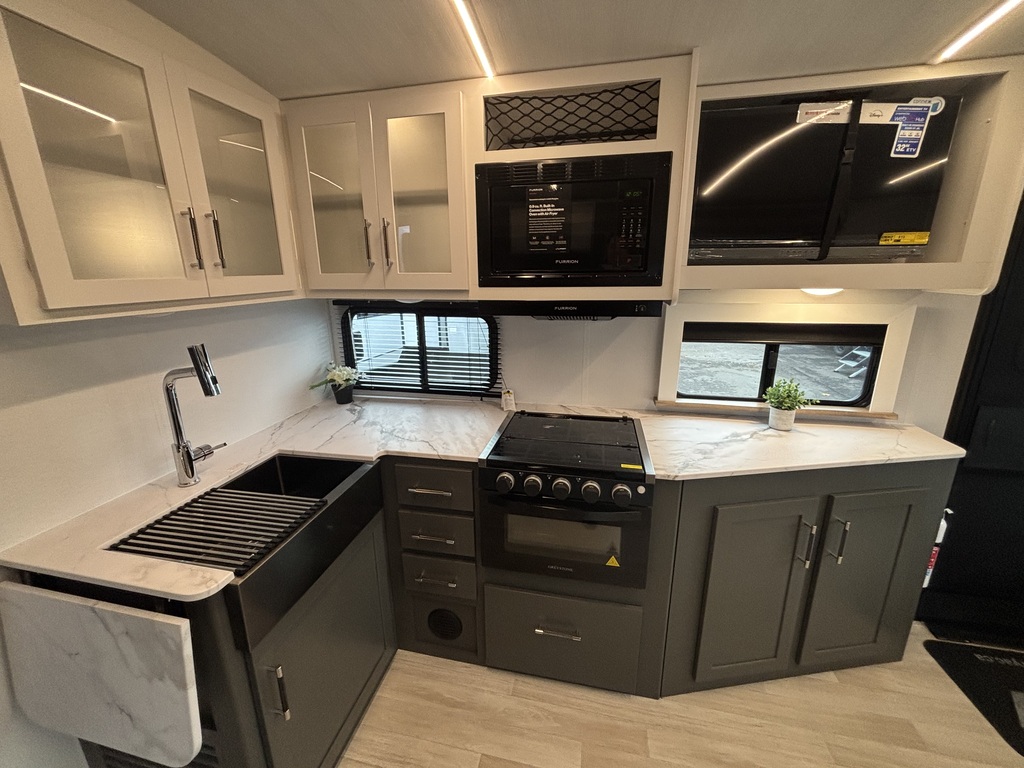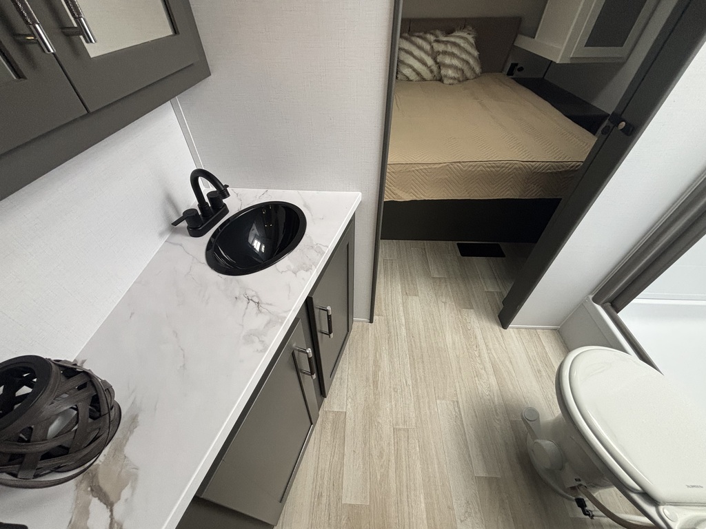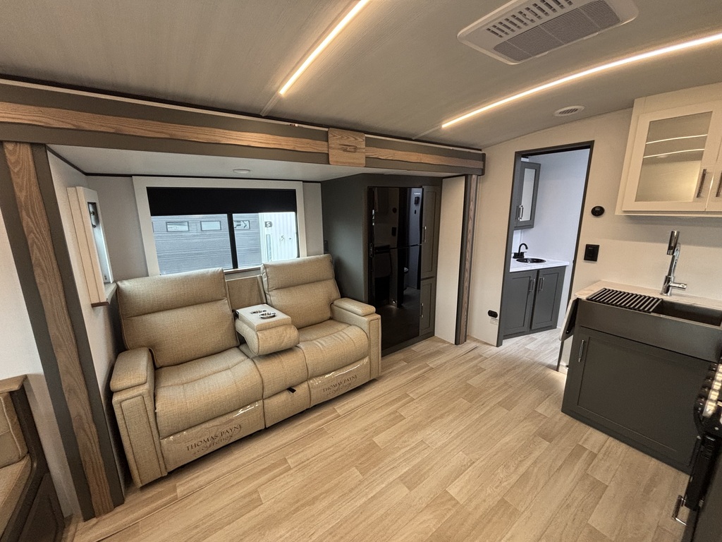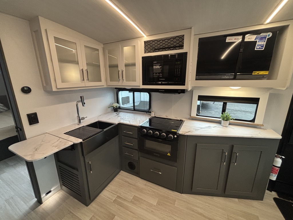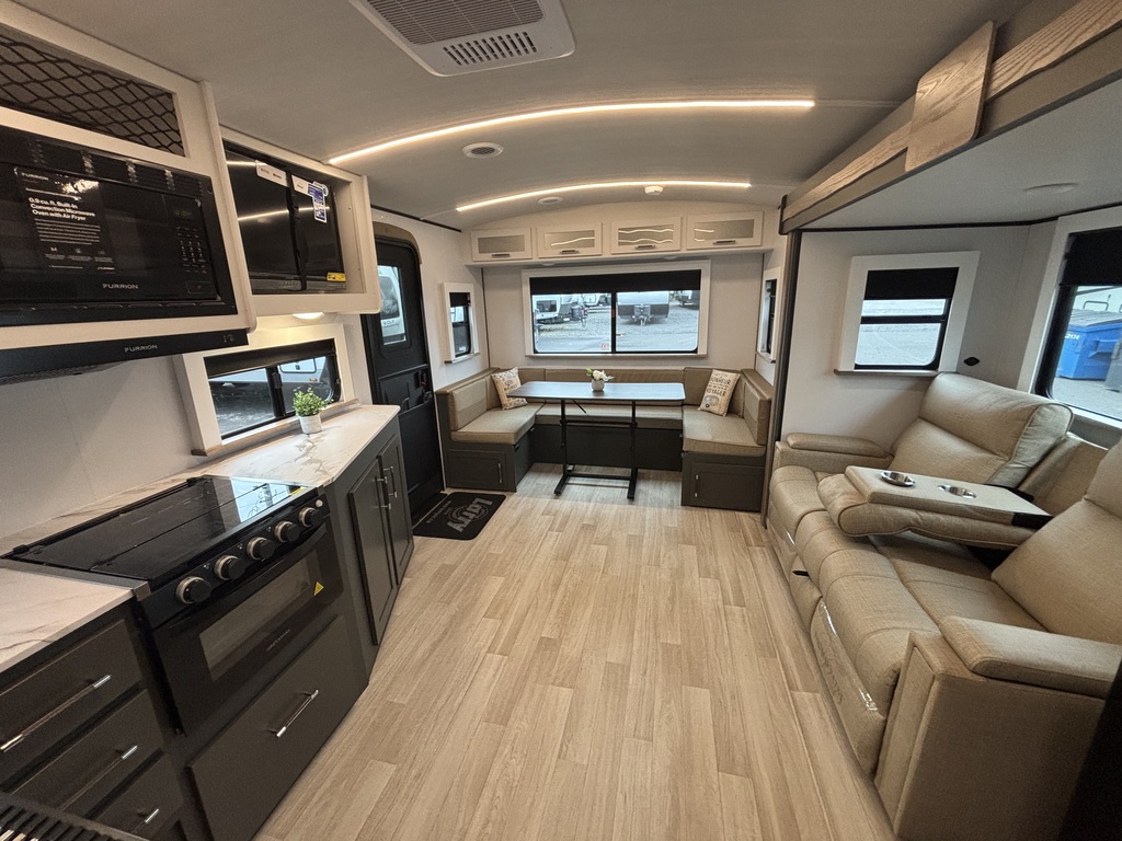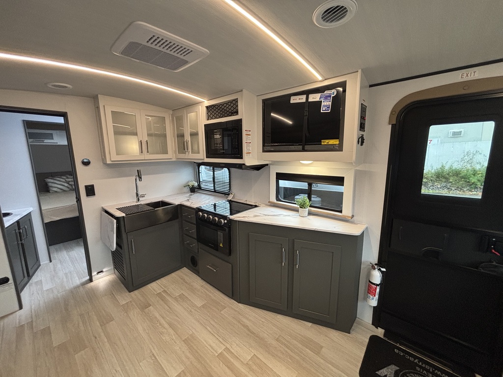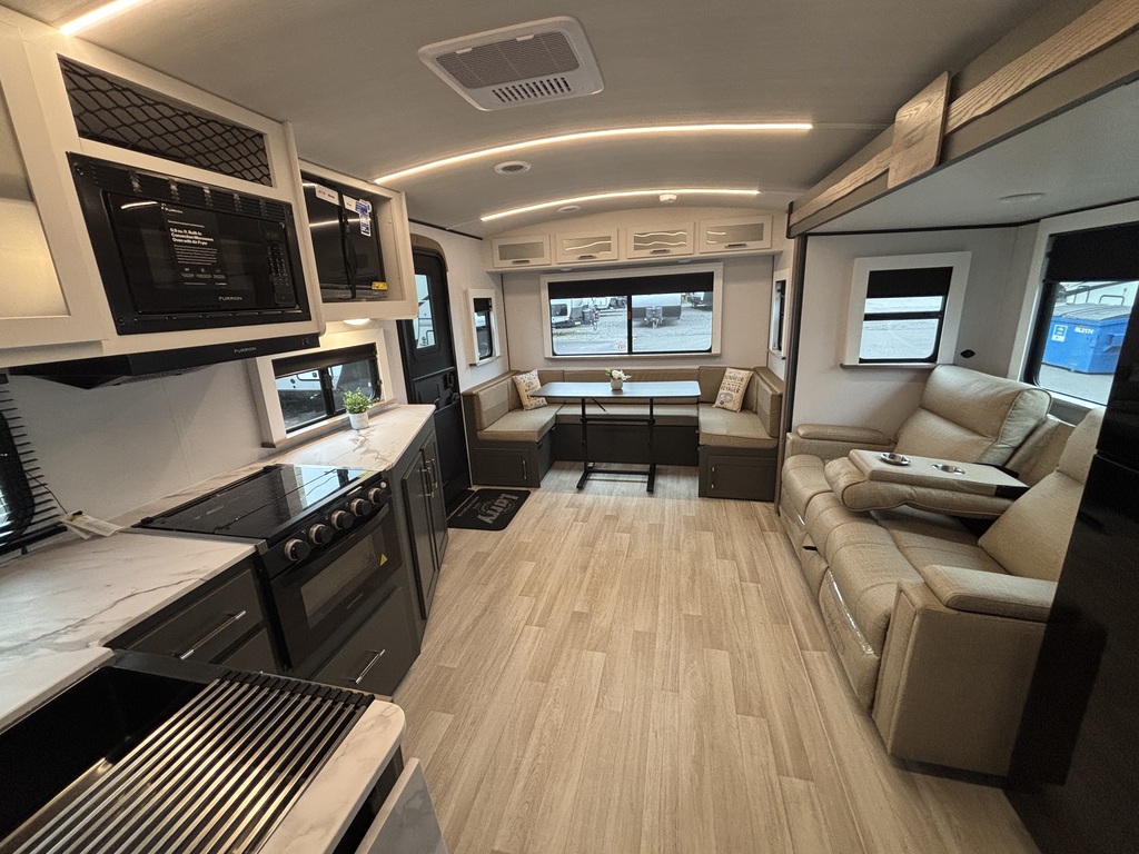 EN INVENTAIRE !!!! BULLET 2530RD 2026 ROULOTTE POUR COUPLE AVEC UN POIDS DE 6000 LIVRES INTÉRIEUR: - Belle cuisine de couleurs crème et gris foncé équipée d'une cuisinière avec dessus vitrée, micro-ondes ( air fryer ), grand évier en stainless , grand réfrigérateur et extension de comptoir. - Grand banquette en U à l'arrière entourée d'une belle fenestration - Salle de bain centrale avec belle vanité - Chambre arrière avec grand lit, rangement tout autour et sortie indépendante sur l'extérieur EXTÉRIEUR: - Auvent électrique avec lumières - Marches ultra robustes - Coffres de rangement - Jack électrique photos à titre indicatif