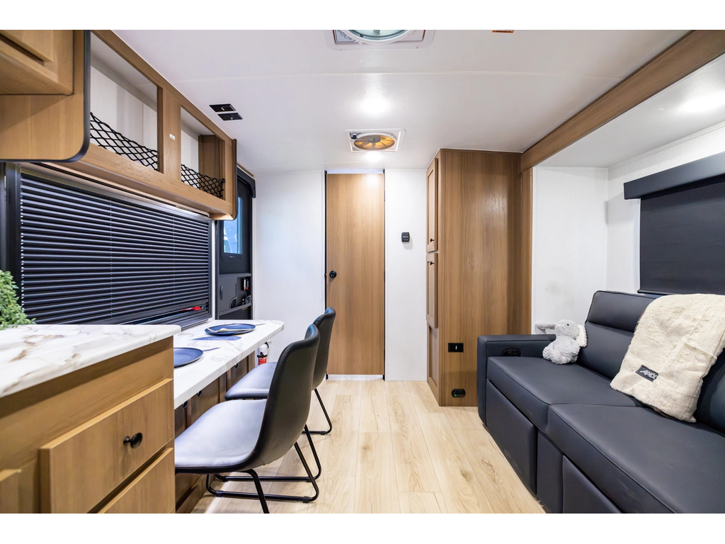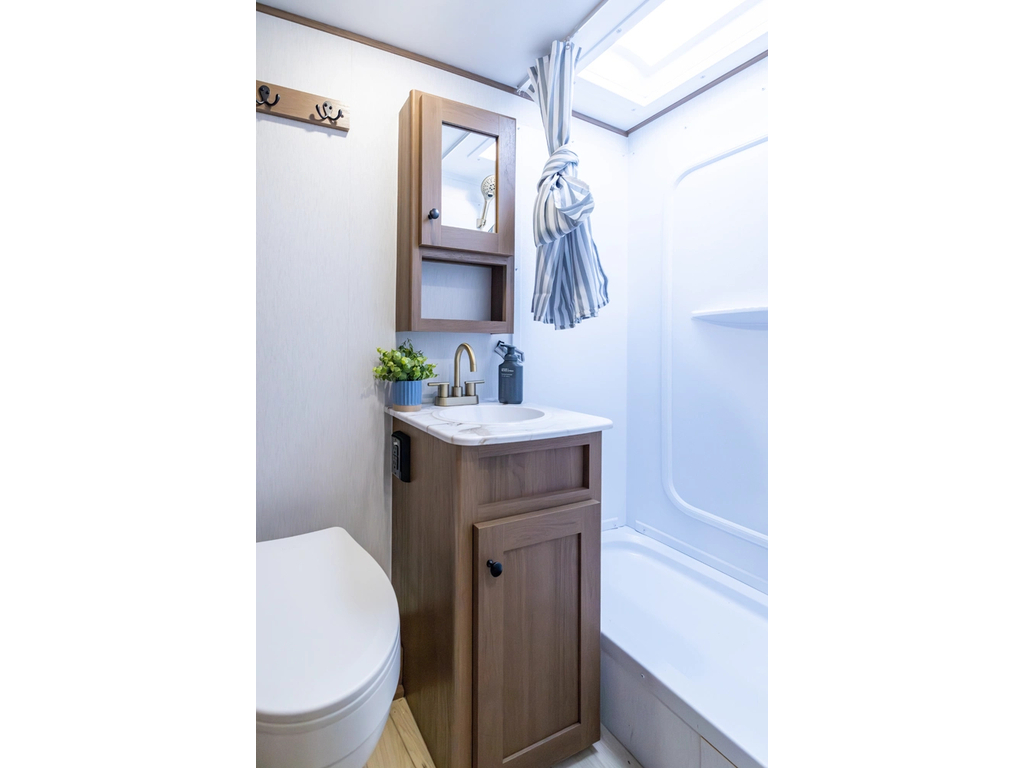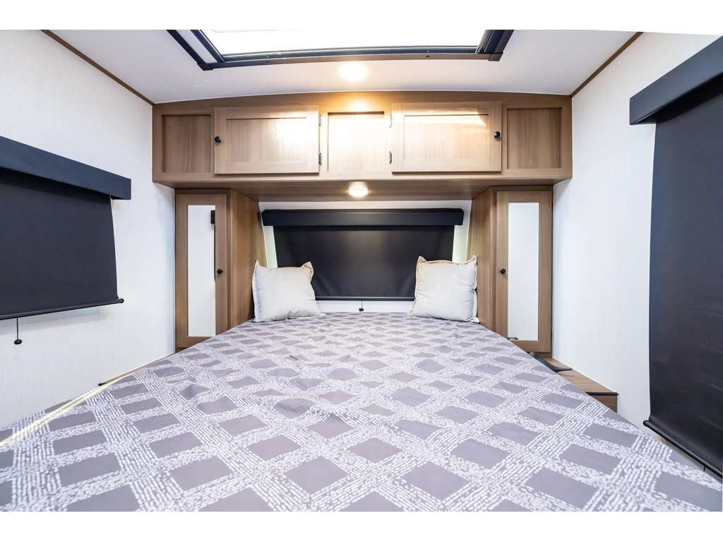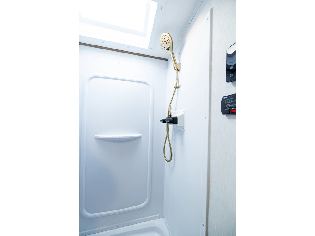 Options : Réservoir de propane, Climatiseur au plafond, Vérin stabilisateur, Roue de secours, Douche extérieure, Douche, Toilette, Lit queen-size, Prise électrique, Prise cable, Micro-onde, Cuisinière, Auvent, Chauffe-eau à allumage direct Haut-parleur sans fil Bluetooth Alpine Premium monté, Climatiseur 15 000 BTU, Panneau solaire de 400 watts avec chargeur de contrôle de 30 ampères, Réfrigérateur 12 V de 10 pi³, Friteuse à air pour micro-ondes, Chauffe-eau instantané à la demande (48 000 BTU), Douche extérieure chaude/froide, Rinçage du réservoir noir, Construction de cages en aluminium, Parois latérales en fibre de verre double Azdel laminée collée sous vide