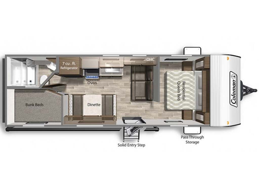 Options : Climatiseur au plafond, Ventilateur au plafond, Roue de secours, Douche, Toilette, Lit queen-size, Lits superposés, Téléviseur, Cuisinière, Four, Hotte, Fourneau, Auvent