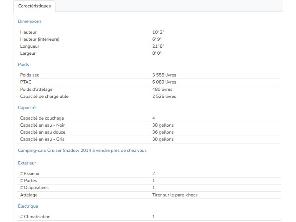 Paiement à partir de $/sem. + TX. 2014 Cruiser RV Shadow Cruiser 195RBS Magnifique roulotte de voyage de 19 pieds - 3 586 lb - capacité de couchage de 4 personnes (lit queen et canapé-lit) - Réfrigérateur propane/électrique - Auvent électrique - 1 extension pour plus d'espace de vie - VR vendu dans notre section bricoleur: Infiltration d'eau à l'avant, tous les appareils fonctionnent, bon état des pneus! Vendu sans garantie. Contactez nos conseillers par téléphone, courriel ou texto ! Nous acceptons les échanges de tout genre et on s'occupe de votre financement sur place ! VR Thetford est votre spécialiste en véhicules récréatifs et de loisirs (VR, motorisés, roulottes, fifth wheel, remorques, VTT, côte-à-côte et motoneiges). Notre équipe saura vous guider dans votre choix de véhicules et d accessoires. Nous sommes concessionnaire Jayco, Passport, Flagstaff, Compass, Magnitude, Outlaw, Alcom, Remjco, Laroche, Talaria et Polaris ! Au plaisir de vous servir ! *Photos à titre indicatif. Certains accessoires et équipements pourraient être en sus* *Prix sujet à changement sans préavis, valider le prix auprès d'un conseiller*