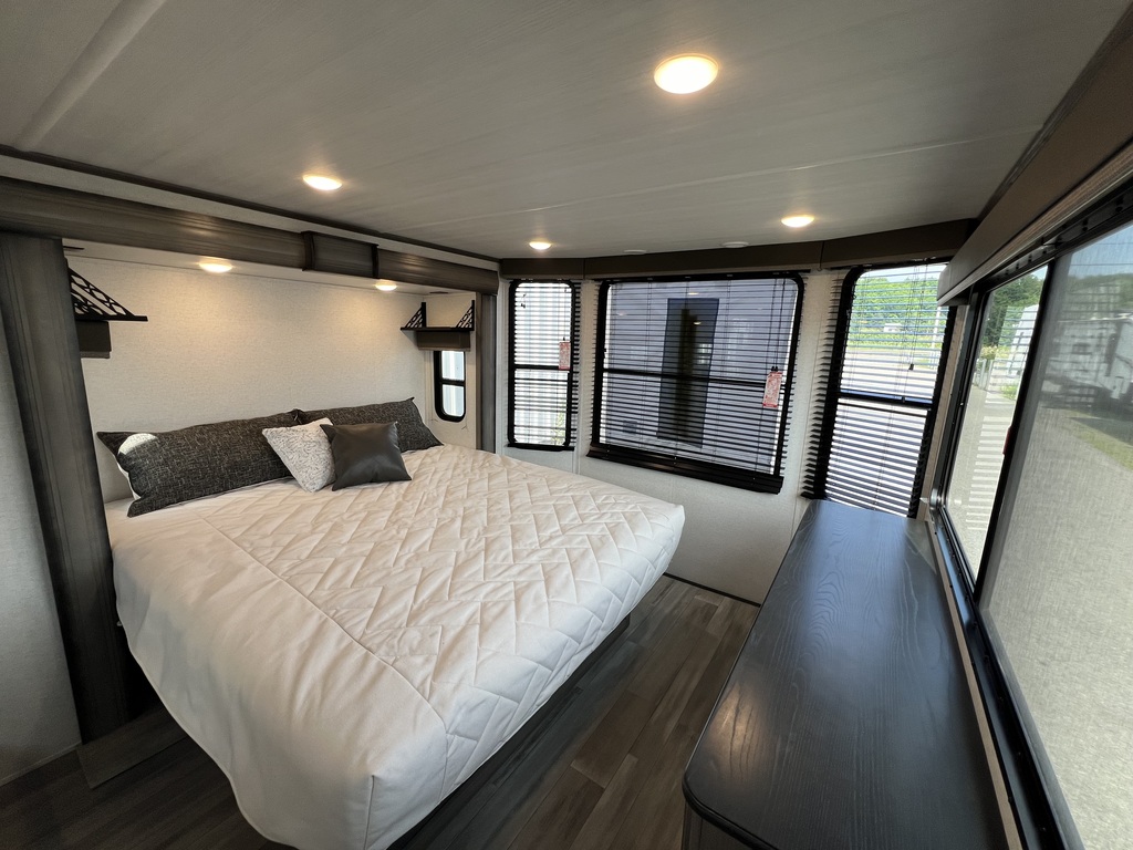 Options : Douche, Toilette, Téléviseur, Micro-onde, Cuisinière, Four, Porte Coulissante Cette magnifique roulotte de parc allie modernité et confort. Hauts plafonds de 8 pieds : sensation d'ouverture et de luminosité Chambre avant avec lit king Double loft : parfait pour les familles et les invités Salon et cuisine combinés : canapé sectionnel, îlot avec quatre tabourets de bar Grandes fenestrations et porte patio : accès facile, vues magnifiques et air frais Salle de bains spacieuse : 2 lavabos, grande douche avec siège, placard pour laveuse/sécheuse Vous vous sentirez chez vous dans cette Residence exceptionnelle! Intéressé(e) ? Venez voir ! Rien de mieux qu'une visite en personne pour solidifier votre opinion. Chez Roulottes Turmel, notre équipe motivée et dévouée saura vous rassurer et vous aider dans vos recherches. Notre but est d'offrir le meilleur service-conseil relatif aux véhicules récréatifs ainsi qu'aux produits de qualité s'y rattachant. Nous saurons trouver ce qui vous conviendra pour rendre vos futures expériences de voyage et de camping inoubliables. *L'unité en stock pourrait légèrement différer des images présentées.