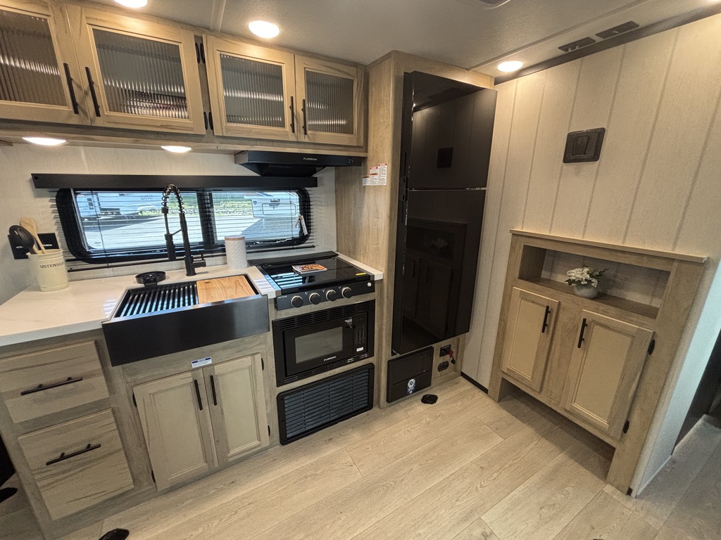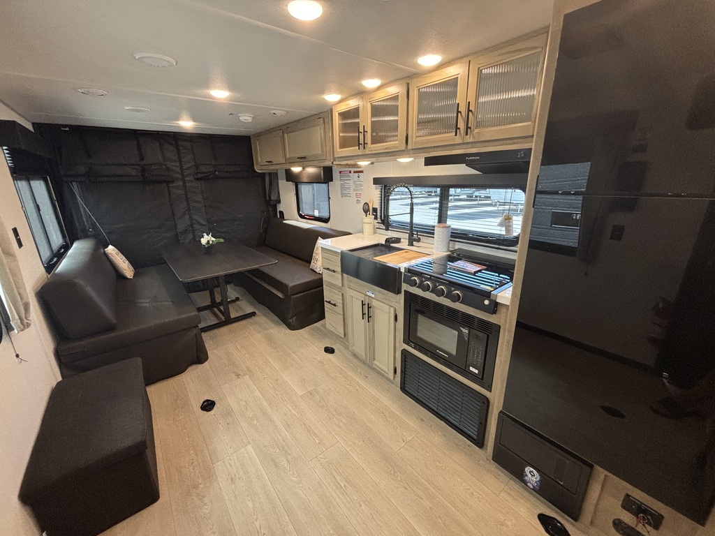 GREY WOLF 25RR BLACK LABEL 2026. Roulotte cargo avec un poids de 5300 livres INTÉRIEUR: - Cuisine avec comptoir robuste, évier double, cuisinière 3 ronds, micro-ondes convection et air fryer et grand réfrigérateur - Grande banquette en cuir qui se transforme en lit pour les invités - Chambre avant avec lit queen et rangement tout autour - Salle de bain avec belle vanité, beaucoup de rangement et douche en coin EXTÉRIEUR: - Marches ultra robustes - Jack électrique - Finition gel coat - Fenêtres sans contour - Coffres de rangement - Auvent électrique - Rampe cargo qui se transforme en patio photos à titre indicatif