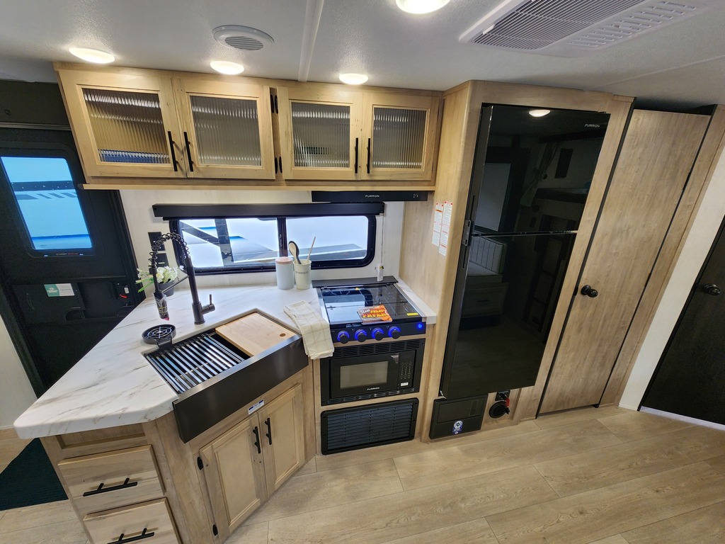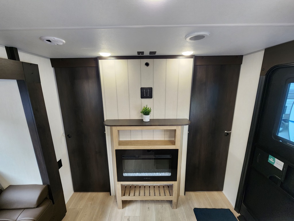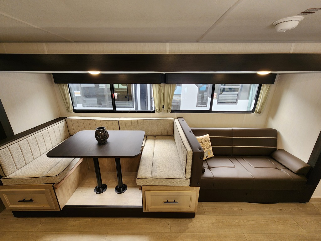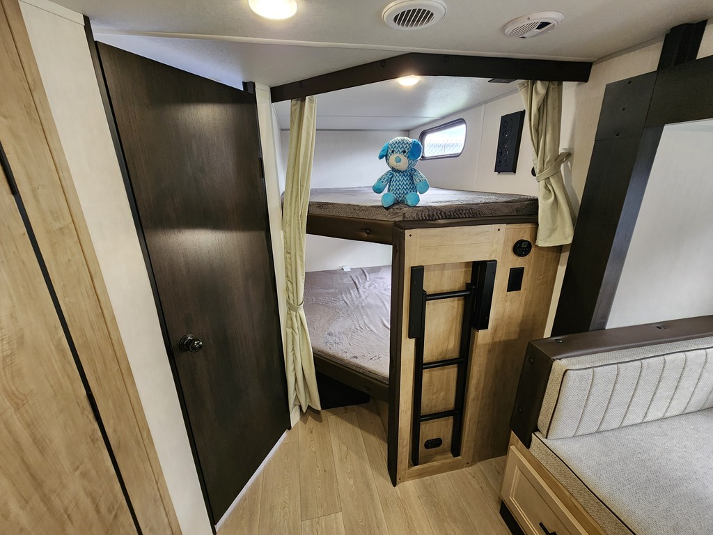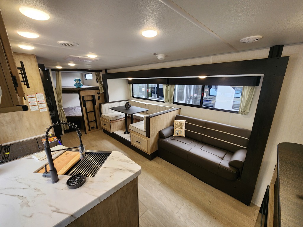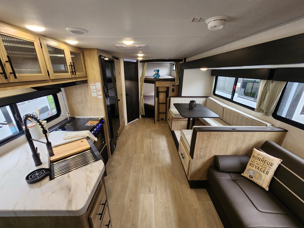 Grey Wolf 26DBH 2026 Roulotte idéale pour la famille. Elle est complètement équipée avec un poids de seulement 6500 lbs. Elle a une extension double avec sofa lit et banquette en "U". Pour une plus grande intimité, la chambre avant a de vraies portes et à l'arrière il y a des lits superposés double avec une échelle pour faciliter l'accès. Très pratique, la grande salle de bain a une porte donnant sur l'extérieur. La cuisine a beaucoup de commodité tel qu'un grand évier, 3 ronds de poêle, un réfrigérateur, micro-ondes convection et air fryer, un grand garde-manger et un foyer électrique. Cette roulotte est parfaite pour passer du bon temps à l'extérieur grâce à l'auvent électrique et à la petite cuisine extérieure. Le support arrière peut être pratique pour le transport des vélos ou autres articles (jeux pour les enfants, bois pour les feux). Elle est la plus vendue de sa catégorie. Financement facile sur place. photos à titre indicatif