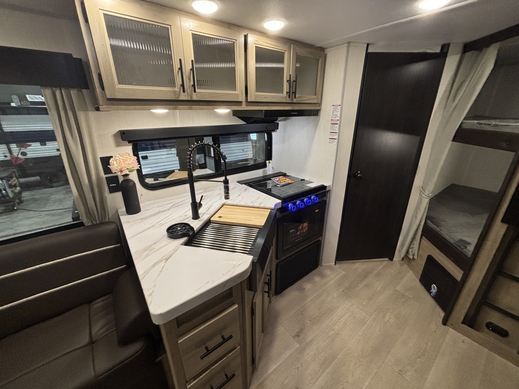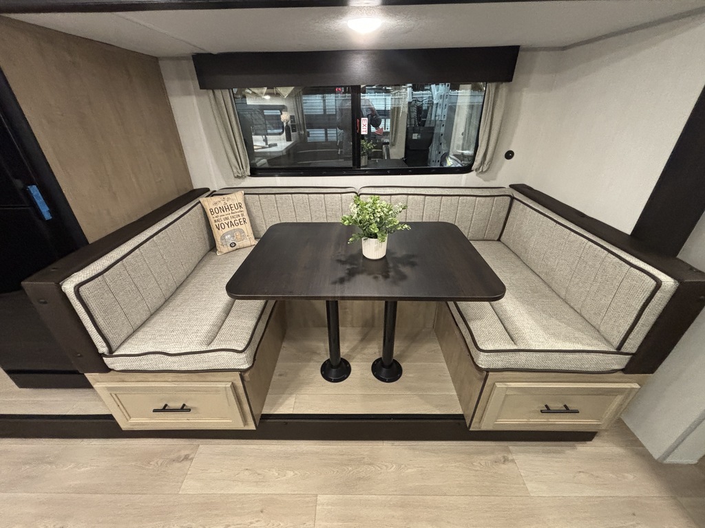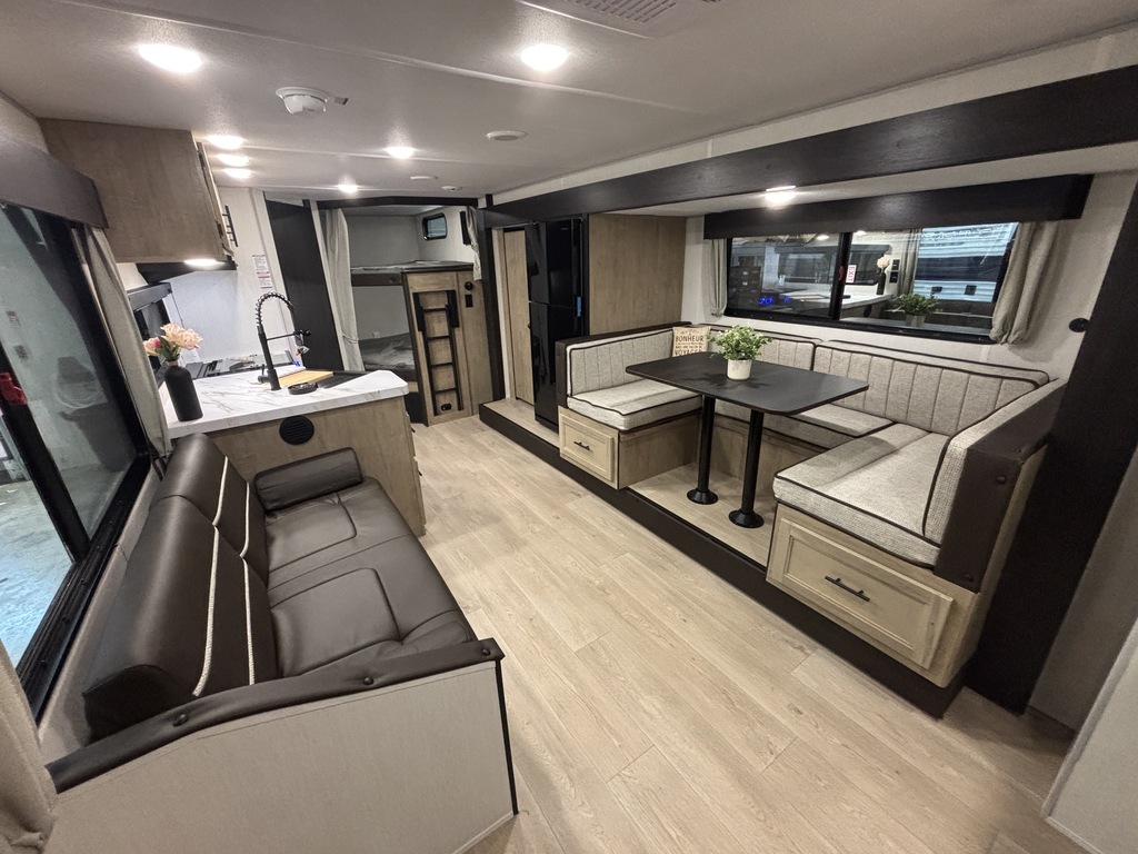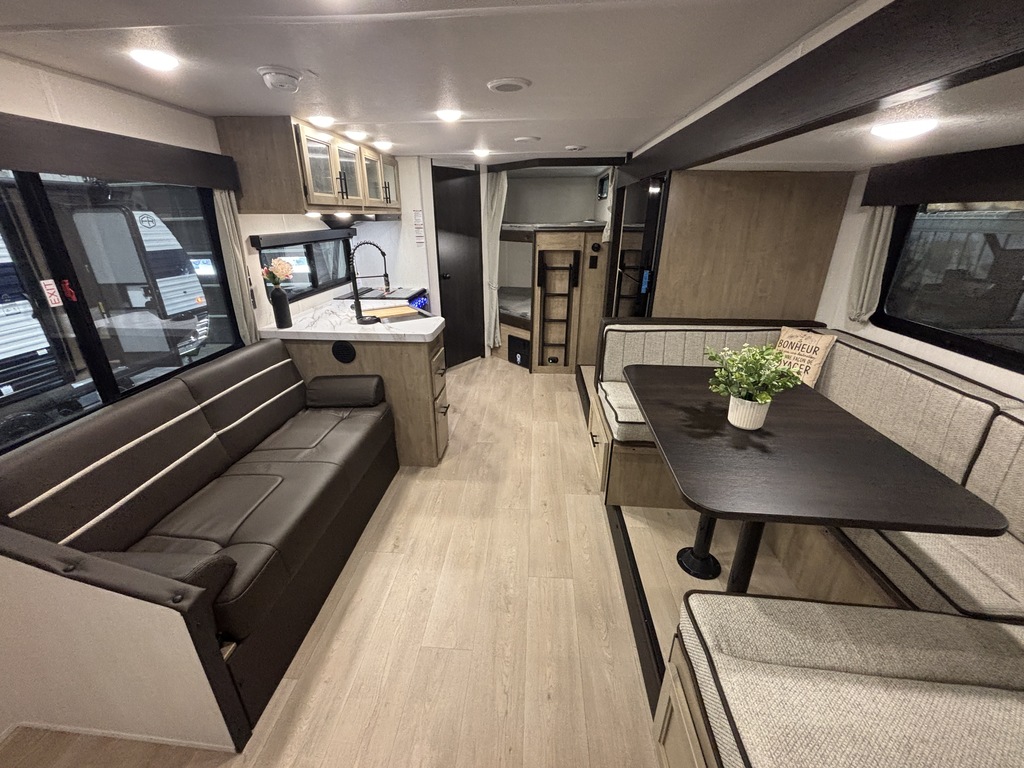 GREY WOLF 26BRB 2026 ROULOTTE FAMILIALE AVEC UN POIDS DE 6400 LIVRES INTÉRIEUR: - Belle cuisine avec évier double, 3 ronds de poêle, micro-ondes avec fonction air fryer, grand réfrigérateur ainsi qu'un grand garde-manger - Grande banquette en U qui se transforme en lit - Sofa qui se transforme en lit - Foyer électrique - Lits superposés double avec échelle - Chambre avant avec grand lit et rangement tout autour - Salle de bain arrière avec sortie indépendante EXTÉREUR: - Marches ultra robustes - Réfrigérateur extérieur, machine à glace et douchette - Coffres de rangement - Jack électrique - Auvent électrique - Rack arrière photos à titre indicatif