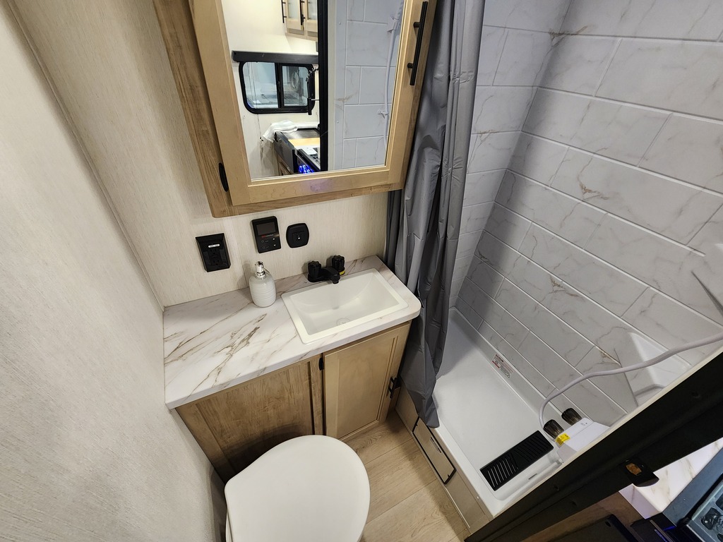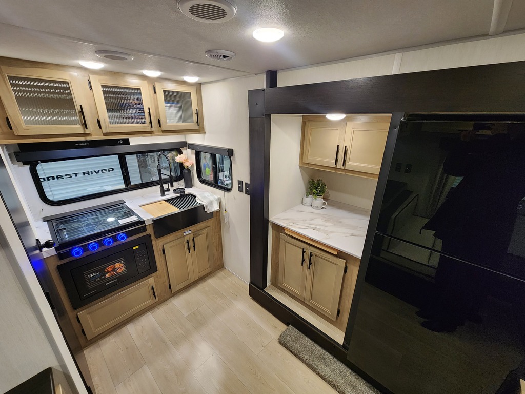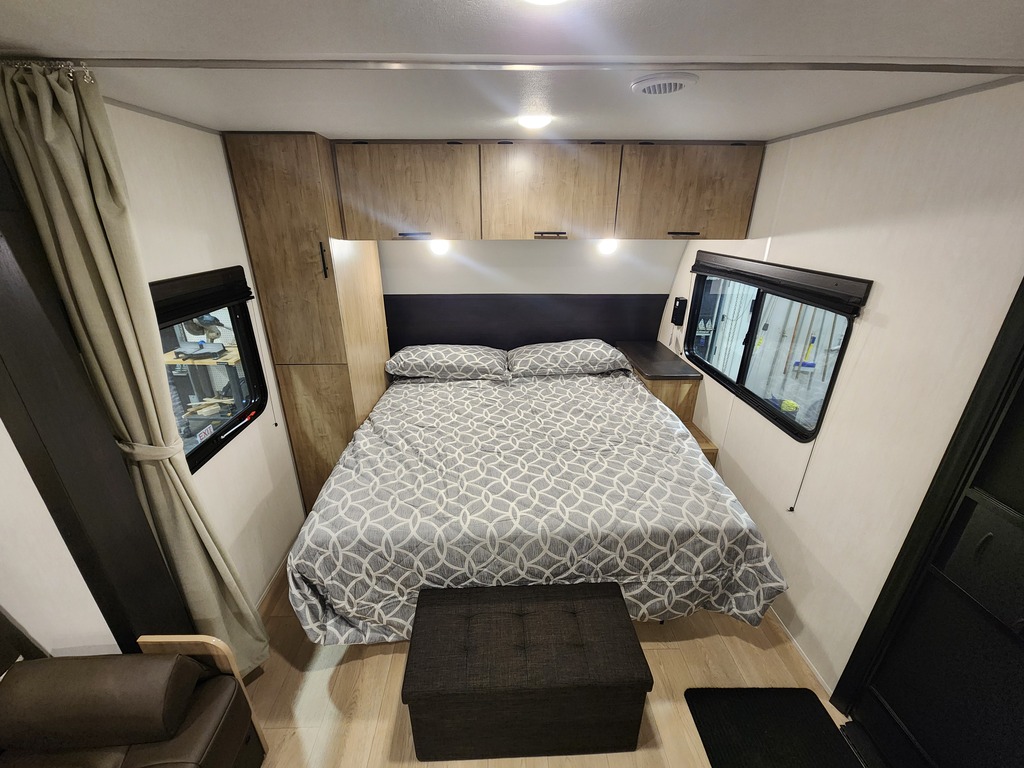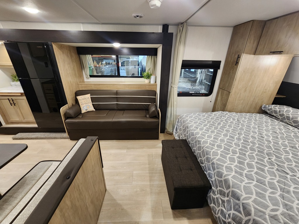 GREY WOLF 22CE 2026. ROULOTTE POUR COUPLE AVEC UN POIDS DE 5300 LIVRES INTÉRIEUR: - Cuisine arrière avec 3 ronds de poêle dessus vitré, micro-ondes convection airfryer, evier et grand réfrigérateur - Petit coin café avec rangement et extension de comptoir - Banquette double à côté d'une belle fenestration - Grand lit avant avec rangement tout autour - Sofa qui se transforme en lit - Salle de bain arrière avec douche et vanité EXTÉRIEUR: - Auvent électrique avec lumières - Marches robustes - Coffre de rangement - Jack électrique - Rack arrière photos à titre indicatif
