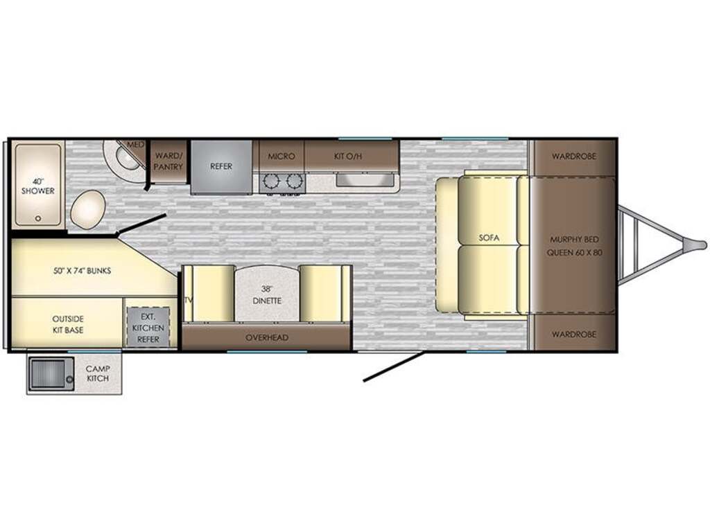Options : Jantes aluminium, Réservoir de propane, Climatiseur au plafond, Climatiseur conduit central, Vérin stabilisateur, Roue de secours, Douche extérieure, Douche, Baignoire, Toilette, Lit queen-size, Lit double, Lits superposés, Lit arrière, Canapé-lit, Prise électrique, Détecteur LPG/CO2, Téléviseur, Chaine stéréo, Prise cable, Antenne pour téléviseur, Micro-onde, Cuisinière, Hotte, Auvent, Plomberie isolée, Chauffe-eau, Chauffe-eau à allumage direct