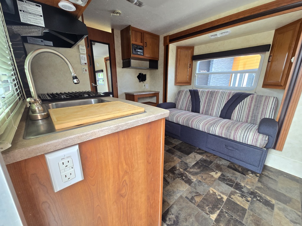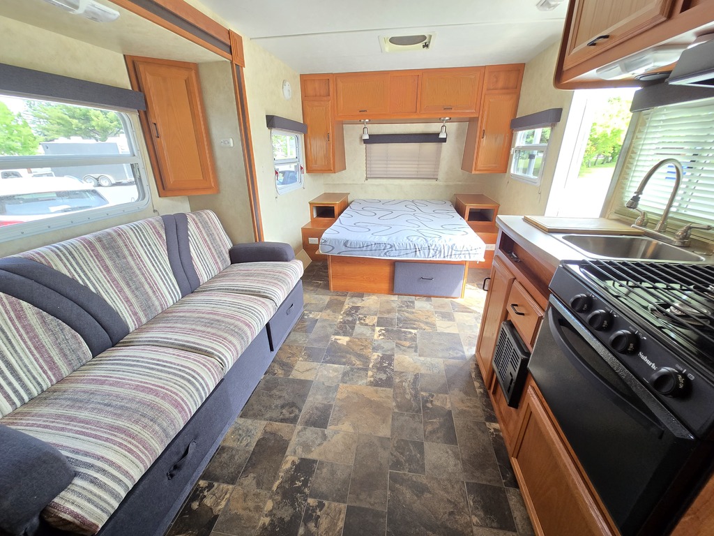 Options : Climatiseur au plafond, Roue de secours, Douche, Toilette, Lit queen-size, Canapé-lit, Micro-onde, Cuisinière, Hotte, Auvent, Chauffe-eau Roulotte pour couple, infiltration d'eau en dessous du plancher. Le plancher n'est pas mou. Vendu tel quel, sans garantie. Garantie : AUCUNE GARANTIE
