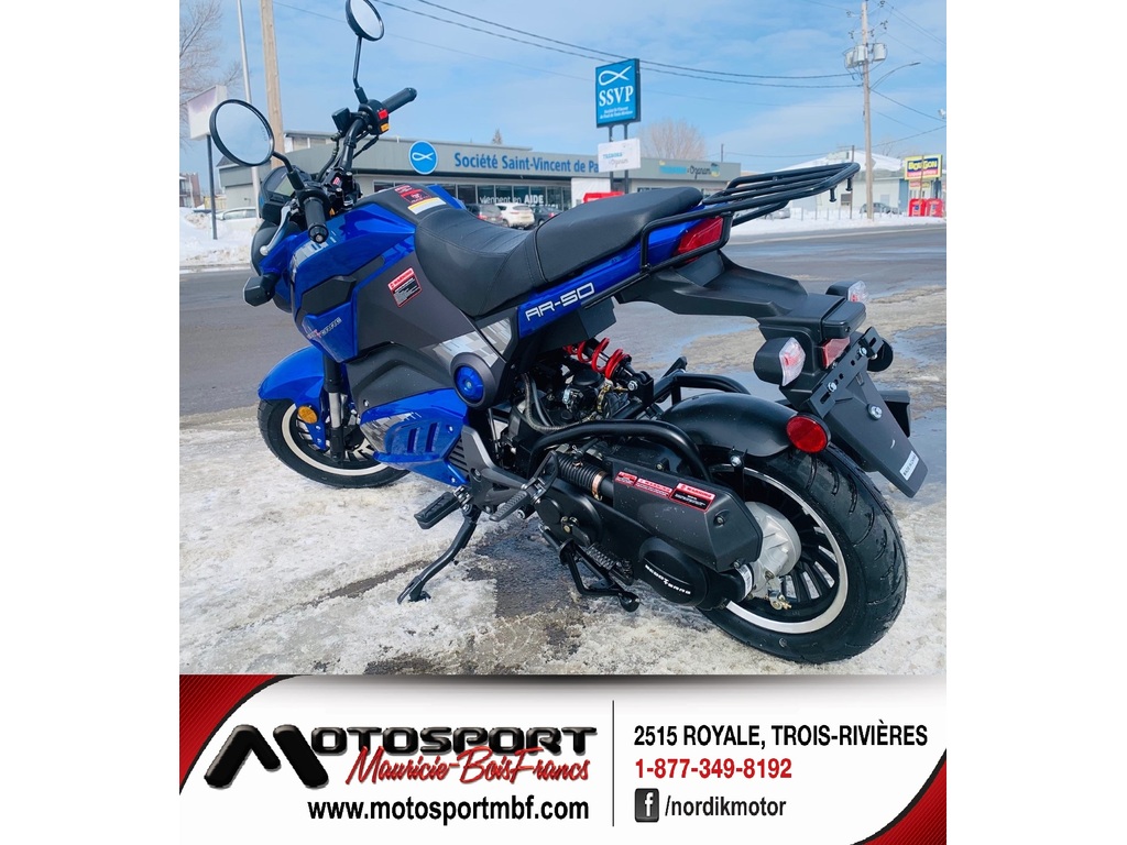 Options : Lumières de conduite, Démarreur électrique, Indicateur de vitesse, Phares de conduite Superbe motoscooter AR-50 « 2022 » tout neuf de la marque montréalaise Scootterrre à seulement 3,599$ ou 60$ par mois ! Roulez avec style sur ce superbe motoscooter AR-50 au style unique à seulement 3,650$ * ou 60$**/mois. Réservez votre AR-50 dès aujourd’hui en prévision de l’arrivage prévu à la fin de juillet en appelant dès maintenant puisque les quantités sont limitées. Épargnez gros avec le motoscooter AR-50 qui permet de rouler pour seulement 2.5 litres aux 100 km et vous permet de rendre votre adolescent autonome pour aller à l’école, au boulot ou partout où il le désire pendant que vous vaquer à nos occupations. Cette motoscooter est munit d’un moteur 4 temps 49cc qui nécessite peut d’entretien qui vous permettra d’atteindre une vitesse de pointe de plus 55 km/h et des accélérations impressionnantes ! Il est munit de frein avant à disque et de frein arrière à tambour qui assure un excellent freinage. Soyez vert cette été et faites tourner les têtes sans vous ruiner avec le superbe motoscooter AR- 50 de Scootterre ! Venez le voir, ça vaut le détour ! Osez comparer avec nos véhicules avec la compétition (Artic Cat, BRP Can-Am, Honda, Kawasaki, Polaris, Suzuki, Yamaha) et vous économiserez des milliers de $. Au plaisir de vous servir! MOTOSPORT MAURICIE BOIS-FRANCS 2515 Royale Au cœur de Trois-Rivières depuis 2005 Sans frais 877-349-8192 Site web www.motosportmbf.com CONCESSIONNAIRE NORDIK MOTOR CANADA VISITEZ LE WWW.NORDIKMOTOR.COM * Transport, préparation inclus ! Taxes applicables en sus ! ** Prêt ouvert avec terme de 84 mois à 8.90%. ** Certaines conditions s’appliques Garantie : 12 mois sur les pièces