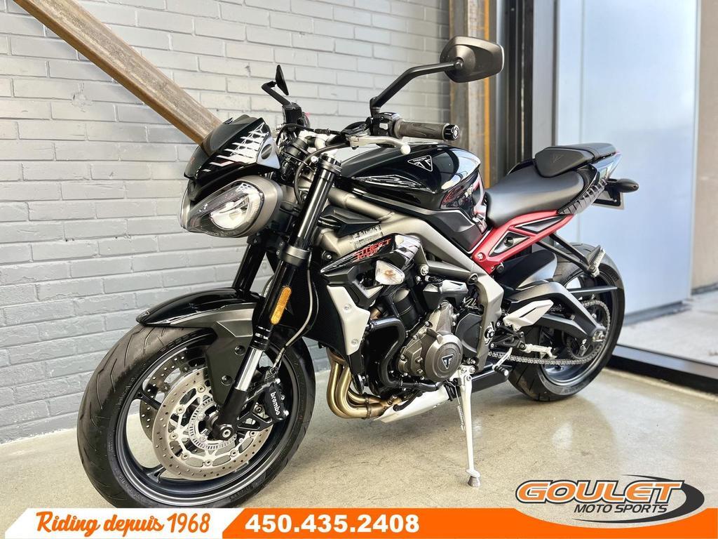 Moto Triumph Street Triple R 765 \*\*\* MOTO QUASI NEUVE ET IMPECCABLE AVEC SEULEMENT 3617KM \*\*\* Avec son moteur 3 cylindres typique chez Triumph, cette Street Triple développe un très impressionnant 121hp avec 59lb de couple (torque). Mais outre son look naked super réussi, c'est une moto moderne avec son écran couleur TFT et tout son équipement électronique. - Moteur 3 cylindres DOHC, 4V par cylindre de 765cc - 6 vitesses Shift Assist - 3 modes de conduite (Road, Rain, Sport) - Écran TFT avec lap timer, position de vitesses, TPMS Ready, - Contrôle de traction ajustable - Freins ABS Cette unité est chez Goulet Moto Sports de Ste-Thérèse. Téléphonez au 450.435.2408 Possibilité de financement avec plusieurs institutions financières. 2ième chance au crédit disponible. Goulet Moto Sports est votre concessionnaire moto depuis 1968. Fier représentant officiel des marques HONDA, APRILIA, MOTO GUZZI, VESPA, PIAGGIO, KTM, NIU, SURRON et URAL pour le grand Montréal. Nous avons un énorme choix de moto usagés inspectées par nos professionnels. 2 adresses pour vous servir, soit à Sainte-Thérèse (450.435.2408) et Saint-Jérôme (450.431.6622). Goulet Moto Sports ne peut être tenu responsable d'une omission, d'un délai ou d'une erreur de transcription de l'information. Le prix affiché reflète la condition de l'unité. Pour différentes raisons les prix peuvent différer de ceux indiqués en ligne. Les données sont affichées à titre indicatif seulement et ne peuvent être considérées comme une information contractuelle. Nous vous encourageons vivement à nous consulter pour plus de détails avant de vous déplacer. Des frais tels que taxes, immatriculation, administrations ou autres peuvent s'appliquer. Comparable à une Aprilia Tuono, Yamaha FZ-09, Honda CB750, Ducati Monster, Suzuki GSX750F Essence, Transmission: Manuelle, 6 vitesses, Système de refroidissement: Refroidi au liquide, 3 cylindres, 120.0 CV, 765.0 CC, Garantie: Balance de garantie ou 1 mois ---------------------- Triumph Street Triple R 765 motorcycle \*\*\* ALMOST NEW AND IMPECCABLE MOTORCYCLE WITH ONLY 3617KM \*\*\* With its typical Triumph 3-cylinder engine, this Street Triple develops a very impressive 121hp with 59lb of torque. But apart from its super successful naked look, it is a modern motorcycle with its TFT color screen and all its electronic equipment. - 3-cylinder DOHC engine, 4V per cylinder of 765cc - 6 speed Shift Assist - 3 driving modes (Road, Rain, Sport) - TFT screen with lap timer, gear position, TPMS Ready, - Adjustable traction control - ABS brakes This unit is at Goulet Moto Sports in Ste-Thérèse. Call 450.435.2408 Possibility of financing with several financial institutions. 2nd chance credit available. Goulet Moto Sports has been your motorcycle dealership since 1968. Proud official representative of the HONDA, APRILIA, MOTO GUZZI, VESPA, PIAGGIO, KTM, NIU, SURRON and URAL brands for greater Montreal. We have a huge selection of used motorcycles inspected by our professionals. 2 addresses to serve you, in Sainte-Thérèse (450.435.2408) and Saint-Jérôme (450.431.6622). Goulet Moto Sports cannot be held responsible for an omission, delay or error in transcribing information. The price shown reflects the condition of the unit. For various reasons prices may differ from those indicated online. The data is displayed for informational purposes only and cannot be considered as contractual information. We strongly encourage you to contact us for more details before traveling. Fees such as taxes, registration, administration or others may apply. Gasoline, Transmission: Manual, 6 speeds, Cooling System: Liquid cooling, 3 cylinders, 120.0 HP, 765.0 CC, Warranty: Balance de garantie ou 1 mois