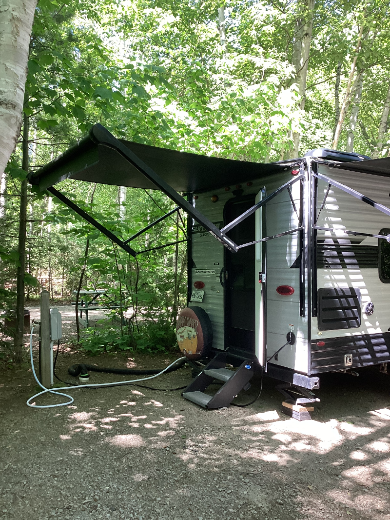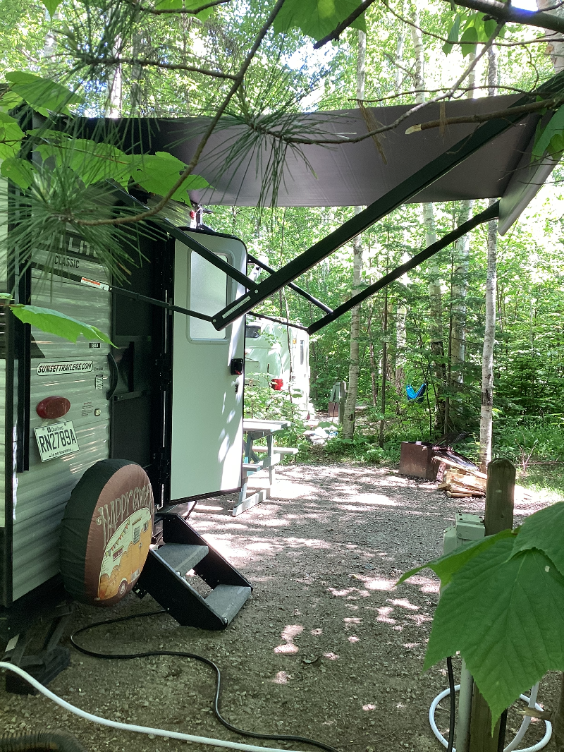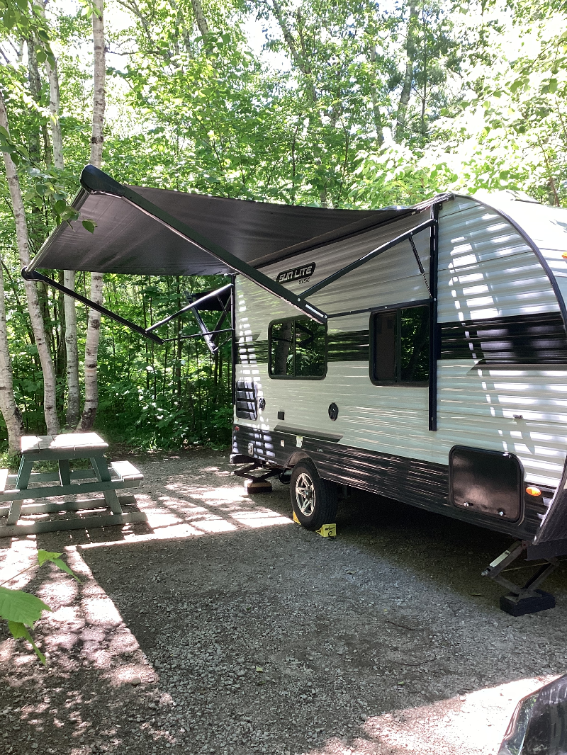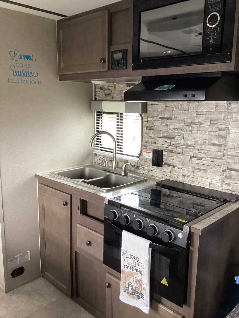 Sun-Lite 18RD avec porte arrière, 2021, 19pi, 2850lbs, achetée neuve par le vendeur, très propre, vérin électrique à l?avant, support pour 2 bouteilles de propane, 2 auvents électriques (arrière et côté), douchette extérieure, système de nettoyage des eaux noires, lumières extérieures au Dell, radio avec haut-parleurs int. et ext., grand frigo deux portes (élect. et propane), cuisinière trois ronds et four au propane, toilette et grande douche séparées, lit queen permanent (légèrement modifié pour améliorer le rangement au dessus du lit mais peut être remis en place pour permettre un 3e couchage pour un enfant), climatisation électr. et chauffage au propane, aération par Max-fan dans sdb, inclus BBQ Martin branchable à la ligne de propane de la roulotte et barres anti-louvoiement(swing-bar)