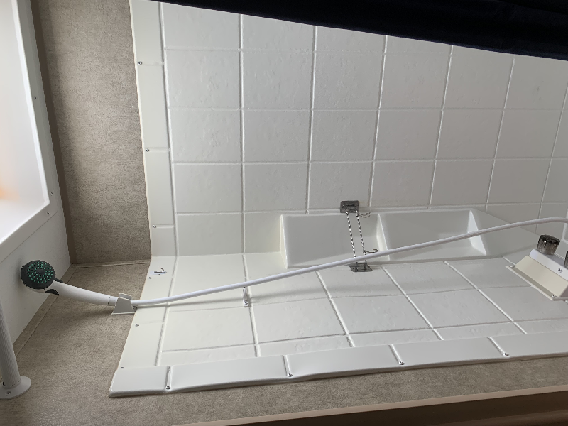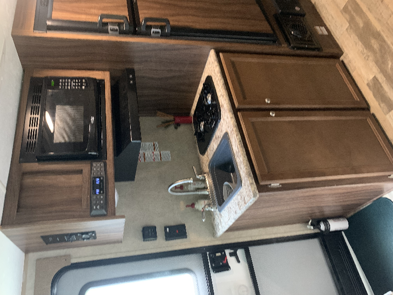 Roulotte légère idéale pour voyageurs pouvant accueillir 4 personnes avec grand réfrigérateur cuisinette extensible beaucoup de rangement installation solaire auvent électrique salle de bain avec lavabo lit avec sorties de chaque côté gros réservoir au propane pneus changés automne 2024