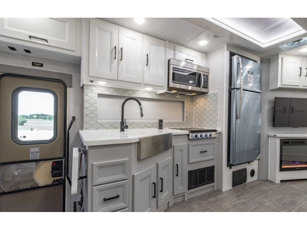 Coachmen Encore 325SS 2023. Le 325SS mesure environ 35 pieds 4 pouces de longueur et 1 extension a mur plein, un lit king size avec un système de rangement spécialement conçu, un grenier abattant électrique, une cheminée, des espaces de vie et de salle à manger spacieux, ainsi qu'une cuisine extérieure et un centre de divertissement. Cet Encore est exceptionnellement bien équipé et comprend un ensemble d'appareils électroménagers améliorés en acier inoxydable qui comprend un réfrigérateur résidentiel en acier inoxydable avec inverter de 1 000 W, un micro-ondes à convection, une grande table de cuisson ainsi qu'un magnifique évier de ferme en acier inoxydable ! Les options supplémentaires incluent le magnifique extérieur peint sur toute la carrosserie Encore, des sièges de cinéma électrique et une entrée laveuse/sécheuse empilable. Le Coachmen Encore présente une liste incroyable de caractéristiques standard et de points forts de construction. Vous trouverez les incomparables parois latérales Azdel™ Noble Select, un toit monobloc en fibre de verre, un générateur de 5,5 kW, un attelage de 8 000 lb, un service de 50 A, un moniteur de vision arrière avec caméras de recul et de vue latérales haute définition, des vérins de mise à niveau automatiqe , (2) A/C, tiroirs à fermeture douce, comptoirs à surface solide ™ et radio à écran tactile avec Apple CarPlay pour n'en citer que quelques-uns ! L'Encore est propulsé par le tout nouveau V8 Ford® de 7,3 L développant 350 ch et 468 lb-pi. couple et une transmission automatique TorqShift® à 6 vitesses. De plus, vous trouverez un système de suspension amélioré, un contrôle de traction, un volant inclinable et télescopique, des feux de tableau de bord à atténuation automatique, des roues en aluminium de 22,5 pouces. www.citecaravane.com 450-623-5050 170 rue dubois ,St-eustache J7P 4W9 ----------------------------------------------------------------------------------------------------------------------------------------------------------------------------- 2023 Coachmen Encore 325SS. The 325SS measures approximately 35 feet 4 inches in length and features a full-wall slide, king size bed with specially designed storage system, a power drop-down loft, fireplace, spacious living and dining areas, and an exterior kitchen and entertainment center. This Encore is exceptionally well-appointed and features the upgraded stainless steel appliance package which includes a stainless steel residential refrigerator w/ 1000W inverter, a convection microwave, large cooktop, as well as a beautiful stainless steel farm house sink! Additional options include the beautiful Encore full-body paint exterior, power theater seating, and a stackable washer/dryer entry. The Coachmen Encore features an incredible list of standard features and construction highlights as well. You will find the incomparable Azdel™ Noble Select Sidewalls, a one-piece fiberglass roof, a 5.5KW generator, an 8,000 lb. hitch, 50 Amp service, rear vision monitor w/ high definition backup and sideview cameras, automatic leveling jacks, (2) A/Cs, soft closing drawers, solid surface countertops ™, and a touch screen radio with Apple CarPlay to mention just a few! The Encore is powered by the all new Ford® 7.3L V8 with 350HP, 468 ft. lbs. torque, and a 6-speed TorqShift® automatic transmission. Additionally you will find an upgraded suspension system, traction control, tilt and telescoping steering wheel, auto dimming dash lights, 22.5" Aluminum wheelsà www.citecaravane.com 450-623-5050 170 rue dubois , st-eustache J7P 4W9