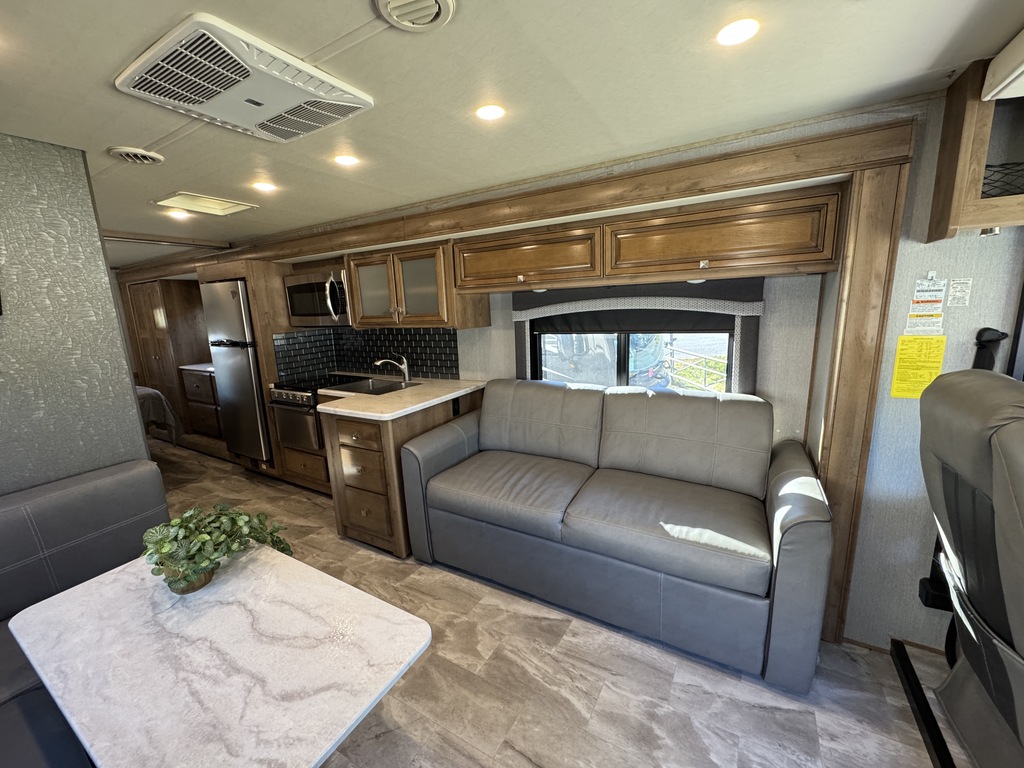 Fleetwood Flair 29M 2021, Mécanique Ford V8 7.3L, Cuisinette extérieur, Grande cuisine intérieur complète avec poêle et four au propane Dometic, Beaucoup de rangements, Réfrigérateur électrique résidentiel, Onduleur de 1000W, Panneau solaire 300W avec controleur de charge, Chambre arrière avec lit king, Lit avant rabbatable, Auvent électrique, Système caméras à angles morts, Téléviseur extérieur avec système audio, Système de son intérieur bluetooth, Jack stabilisateur hydraulique avec commande électronique automatique et beaucoup plus. Une visite vous convaincra! Année : 2021 Mécanique : Ford V8 7.3L Châssis : Ford F53 Carburant : Essence Transmission : TorqShift 6 vitesses automatique Motricité : 4X2 Longueur hors-tout(pieds) : 31 Largeur(pieds) : 8.3 Hauteur(pieds) : 12.3 Empattement(pouces) : 190 PNBV(Lbs) : 18,000 Réservoir essence(Gal.) : 80 Capacité eau fraîche(Gal.) : 50 Capacité eau grise(Gal.) : 37 Capacité eau noir(Gal.) : 37 Capacité réservoir propane(Lbs) : 59 Nombre d’extensions : 1 Capacité d’hébergement : 8 Pneus : 245/70R 19.5G Air conditionné(BTU) : 15,000 Chauffage(BTU) : 30,000 Consulter la brochure du manufacturier en cliquant ici