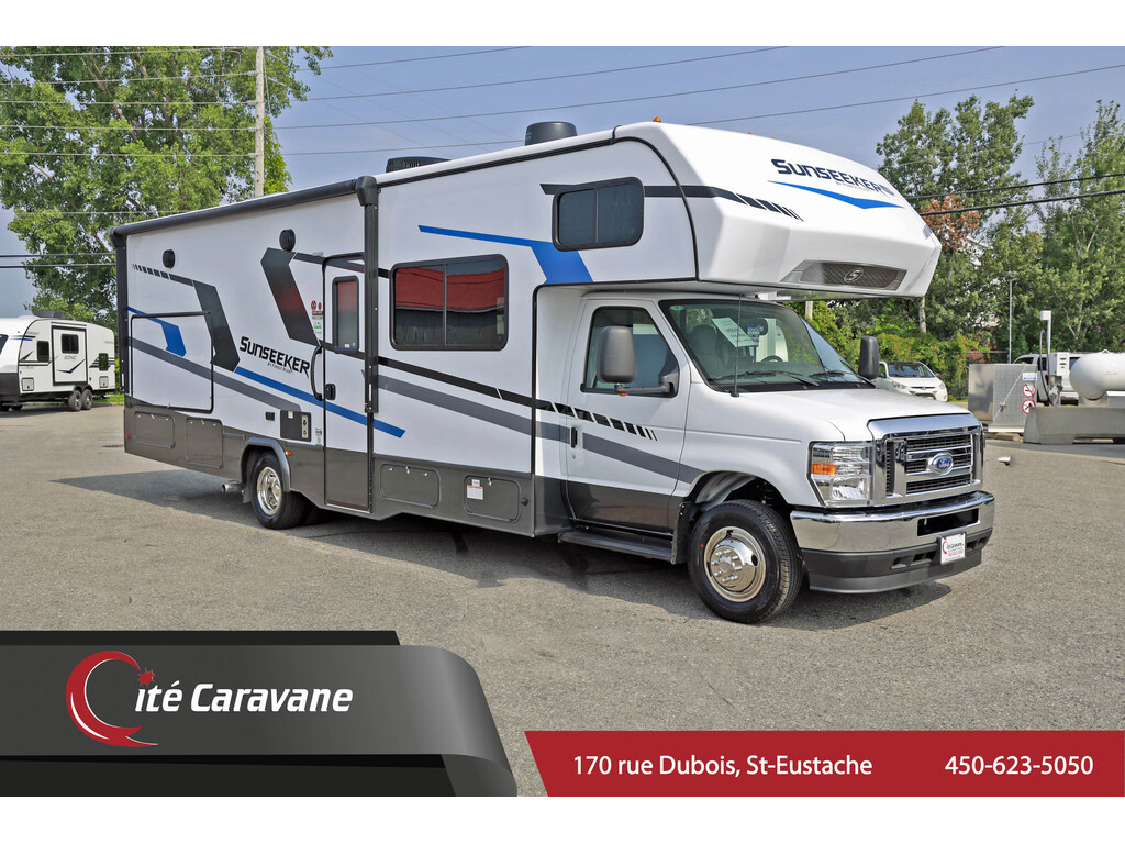 disponible sur commande - available on order Forest River Sunseeker 2860 , 2 extensions + Skirt paint .CLASSE C Tissu : Lava , boiseries : River teak , Ford V-8 7.3L, Prise 30AMP , chauffe eau 6 gallons , chauffage 30,000BTU , A/C au toit 13.5BTU canalisé , ballons a air ride rite , murs de 2, fini gel-coat , toit en fibre de verre , auvent électrique , hitch de 7500lbs , lecteur AM/FM/CD/DVD,TV , frigidaire 10 pieds cube , tiroirs styles résidentiels , cuisinière a trois bruleur ,TV, stores de nuit , plafond de 7 pieds , génératrice de 4000watts onan, 2 batteries auxiliaires , pneu de secours, micro-onde , sièges avant en cuirette. , arctic Pack ( 4 saisons ) couvert en fibre de verre , matelas Queen , Prélart a grandeur Beauflor , antenne digitale, comptoirs de luxe, *PREMIUM CAMPING PACKAGE (mirroirs chauffants/électrique, caméra de recul + latéral et latérales, cinéma maison 5.1 , black tank flush) + entertainment extérieur + panneau solaire 100watts $1420/MOIS + taxes ! www.citecaravane.com 450-623-5050 170 RUE DUBOIS , ST-EUSTACHE, SUR LE BORD DE LA 640! UNE ENTREPRISE FAMILIALE A VOTRE SERVICE DEPUIS 1973 ! , DÉPOSITAIRE NUMÉRO 1 FOREST RIVER SUNSEEKER ! LE SPÉCIALISTE DU VR AU QUÉBEC ! Forest River Sunseeker 2860 2 slides + skirt paint CLASS C fabric : Lava , wood : River teak, Ford V-8 7.3L , 30AMP , 6 gallon water heater , 30,000BTU heater , 13.5BTU ducted roof A/C , ride rite air suspension , 2inch thick walls , gel-coat exterior , fiberglass roof , electric awning , 7500lbs hitch , spare tire , TV , 10 cubic fridge , residential style drawers , 3 range burner , micro-wave , night shades , 7 feet high ceilings , 4000watts Onan generator, 2 auxiliary batteries, spare tire , leatherette front seats , arctic pack ( 4 seasons ) , fiberglass front cap ,Queen matress , Beauflor linoleum throughout , Digital Antenna ,Upgraded countertops,*PREMIUM CAMPING PACKAGE (heated/electric mirrors,back up and side cameras, 5.1 surround sound,black tank flush)+ exterior entertainment . + Solar panels 100watt 1420$/MONTH +taxes. www.citecaravane.com 450-623-5050 ! CALL US TODAY ! Cité Caravane, 170 rue Dubois in Saint-Eustache, adjacent to the 640 highway. A FAMILY OWNED BUISNESS SINCE 1973 ! QUÉBEC s RV SPECIALIST !