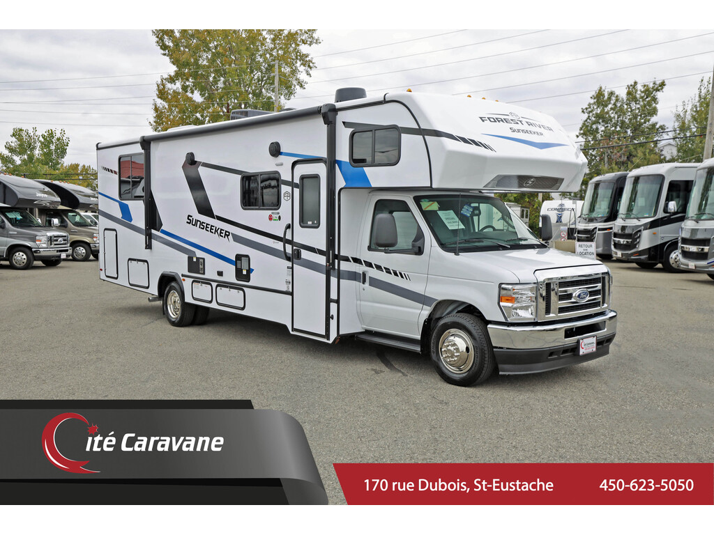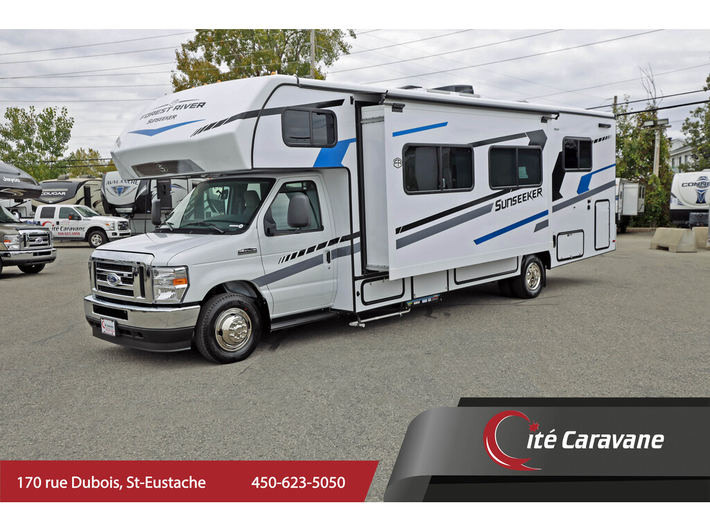 Forest River Sunseeker 2850 LE 1 extension CLASSE C Tissu : Dove grey, boiseries : River Teak: Ford V-8 7.3L, Prise 30AMP , chauffe-eau 6 gallons , chauffage 30,000BTU , A/C au toit 13.5BTU canalisé , murs de 2, fini gel-coat , toit en fibre de verre , auvent électrique , hitch de 7500lbs ,TV , frigidaire 10 pieds cube , tiroirs styles résidentiels , cuisinière a trois bruleur , stores de nuit , plafond de 7 pieds , génératrice de 4000watts onan, batteries auxiliaire, micro-onde , sièges avant en tissue. , arctic Pack ( 4 saisons ) , couvert en fibre de verre , matelas Queen , Prélart a grandeur Beauflor , antenne digitale, comptoirs de luxe , camera de recule + 1377$/MOIS + taxes ! www.citecaravane.com 450-623-5050 170 RUE DUBOIS , ST-EUSTACHE, SUR LE BORD DE LA 640! UNE ENTREPRISE FAMILIALE A VOTRE SERVICE DEPUIS 1973 ! , DÉPOSITAIRE NUMÉRO 1 FOREST RIVER SUNSEEKER ! LE SPÉCIALISTE DU VR AU QUÉBEC ! Forest River Sunseeker 2850 LE 1 slide CLASS C fabric : Dove grey , wood : River Teak : Ford V-8 7.3L , 30AMP , 6 gallon water heater , 30,000BTU heater , 13.5BTU ducted roof A/C , 2inch thick walls , gel-coat exterior , fiberglass roof , electric awning , 7500lbs hitch , , TV , 10 cubic feet fridge , residential style drawers , 3 range burner , micro-wave , night shades , 7 feet high ceilings , 4000watts Onan generator, auxiliary battery, cloth front seats , arctic pack ( 4 seasons ) ,fiberglass front cap , Queen matress , Beauflor linoleum throughout , Digital Antenna ,Upgraded countertops , back up camera+ . 1377$/MONTH +taxes. www.citecaravane.com 450-623-5050 ! CALL US TODAY ! Cité Caravane, 170 rue Dubois in Saint-Eustache, adjacent to the 640 highway. A FAMILY OWNED BUISNESS SINCE 1973 ! QUÉBEC s RV SPECIALIST !