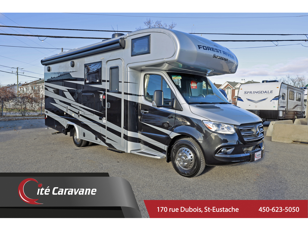 Classe C / B+ 24 pieds Mercedes Sprinter, Forest River Sunseeker MBS 2400T Extérieur : Onyx - Tissu : Dove grey - Boiseries : River teak Mécanique Mercedes turbo diesel 2.0L 4cylindre bluetec ! génératrice Flex Power 4000 watts LP , air climatisée canalisé 15,000btu avec heat pump , chauffage 30,000BTU , chauffe eau 6 gallons (gas + électrique) vitres de luxe , peinture complète , capacité de remorquage de 4200lbs , sièges pivotants ,artic pack (4saisons), télévision , lit queen (60x75) , réfrigérateur 10.7 pi cube , recouvrement de plancher Beauflor , toiture en fibre de verre , marche électrique , auvent électrique , 2 batterie auxiliaires ,haut parleurs extérieur , ensemble de lumières DEL , coffres de luxe moulés , quick connect LP*PREMIUM CAMPING PACKAGE ( caméra de recul et latérales , cinéma maison 5.1 , black tank flush ,toile dextension , stores avant magnétique ) + Panneau solaire 190 watts 1778$+txs/MOIS MEILLEUR PRIX AU CANADA !! Forest River Sunseeker MBS, meilleur qualité prix 24 pieds Mercedes! www.citecaravane.com 450-623-5050, UNE ENTREPRISE FAMILIALE A VOTRE SERVICE DEPUIS 1973 !! LE SPÉCIALISTE DU VR AU QUÉBEC Venez nous voir dès aujourdhui chez Cité Caravane au 170 rue dubois à Saint-Eustache sur le bord de la 640 Classe C B+ , 24 foot Mercedes Sprinter , Forest River Sunseeker MBS 2400T Exterior : Onyx -Material : Dove grey -Wood : River teak Mercedes turbo diesel 2.0L 4 Cylinder bluetech ! 4000 watt LP generator Flex power , 15,000BTU avec heat pymp , ducted roof A/C , 30,000BTU heating system , 6 gallon water heater ( gas/propane ) , luxury frameless windows , full body paint , 4200 pound towing capacity , swivel seats , artic pack (4seasons) , televison , queen size bed (60x75) , 10.7 ft cube refrigerator , Beauflor lineolium through out , fiberglass roof , electric step , electric awning , 2 coach batteries ,exterior speakers , LED lighting , quick connect LP *PREMIUM CAMPING PACKAGE* ( back up and side cameras , surround sound system 5.1 , black tank flush , slide topper , magnetic front shades) + 190Watt solar Panel 1778$+txs/MONTH Forest River Sunseeker MBS, best value for your money!!! Mercedes-Benz ! www.citecaravane.com 450-623-5050 ! CALL US TODAY ! Cité Caravane, 170 rue Dubois in Saint-Eustache, adjacent to the 640 highway. A FAMILY OWNED BUISNESS SINCE 1973 ! QUÉBEC s RV SPECIALIST !