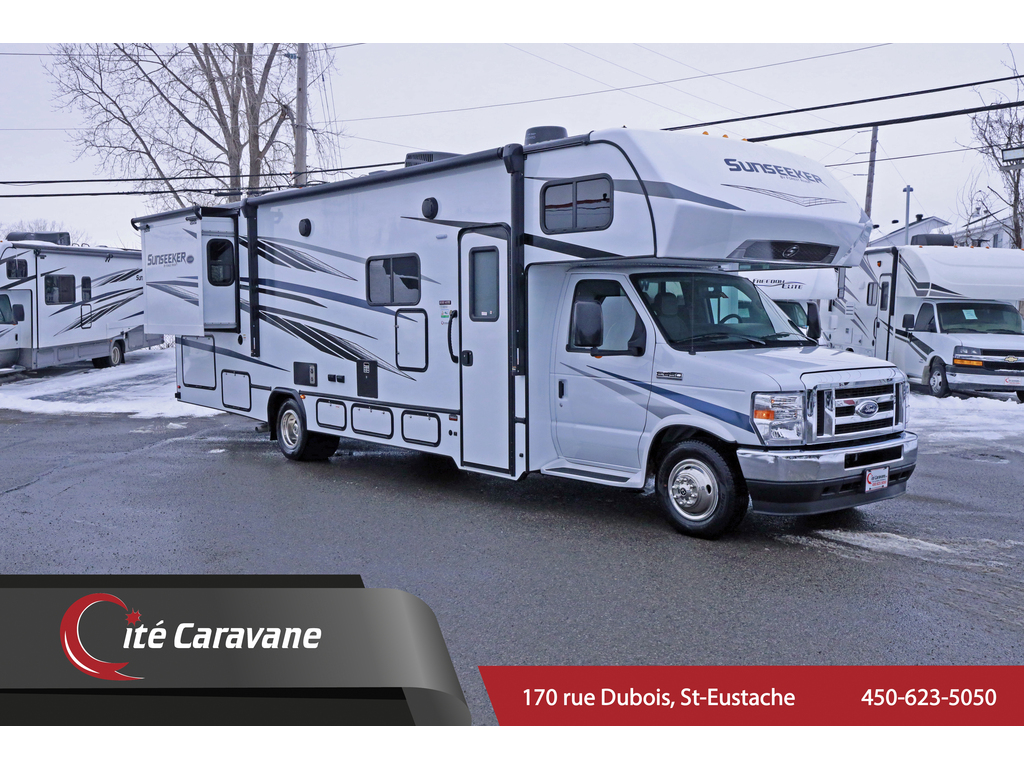 Liquidation !! 129 900$ !! Prix reg 139 900$ Forest River Sunseeker 3010 2 extension CLASSE C + crics hydraulics + base electrique chauffeur + base pivotante passager Tissu :platinium , boiseries : Vermont Oak, Ford 7.3L v8 Prise 30AMP , chauffe eau 6 gallons , chauffage 30,000BTU , A/C au toit 13.5BTU canalisé , ballons a air ride rite , murs de 2, fini gel-coat , toit en fibre de verre , auvent électrique , hitch de 7500lbs ,TV , frigidaire 10 pieds cube , tiroirs styles résidentiels , cuisinière a trois bruleur , stores de nuit , plafond de 7 pieds , génératrice de 4000watts onan, 2 batteries auxiliaires , micro-onde , sièges avant en cuirette appareils en stainless , arctic Pack ( 4 saisons ) couvert en fibre de verre , matelas Queen , Prélart a grandeur Beauflor , antenne digitale, comptoirs de luxe, *PREMIUM CAMPING PACKAGE (mirroirs chauffants/électrique, caméra de recule et latérales, cinema maison 5.1 , black tank flush) + 1166$/MOIS + taxes ! www.citecaravane.com 450-623-5050 170 RUE DUBOIS , ST-EUSTACHE, SUR LE BORD DE LA 640! UNE ENTREPRISE FAMILIALE A VOTRE SERVICE DEPUIS 1973 ! , DÉPOSITAIRE NUMÉRO 1 FOREST RIVER SUNSEEKER ! LE SPÉCIALISTE DU VR AU QUÉBEC ! Forest River Sunseeker 3010 2 slides + hydraulic jacks + electric driver seat + passanger side swivel seat CLASS C fabric : platinum , wood : Vermont Oak , Ford 7.3L V8 , 30AMP , 6 gallon water heater , 30,000BTU heater , 13.5BTU ducted roof A/C , ride rite air suspension , 2inch thick walls , gel-coat exterior , fiberglass roof , electric awning , 7500lbs hitch , spare tire , 2 TV , 10 cubic feet fridge , residential style drawers , 3 range burner oven , micro-wave , night shades , 7 feet high ceilings , 4000watts Onan generator, 2 auxiliary batteries , leatherette front seats , stainless steel appliances , arctic pack ( 4 seasons ) , fiberglass front cap , queen bed , Beauflor linoleum throughout , Digital Antenna ,Upgraded countertops,*PREMIUM CAMPING PACKAGE (heated/electric mirrors,back up and side cameras, 5.1 surround sound,black tank flush)+ 1166$/MONTH +taxes. www.citecaravane.com 450-623-5050 ! CALL US TODAY ! Cité Caravane, 170 rue Dubois in Saint-Eustache, adjacent to the 640 highway. A FAMILY OWNED BUISNESS SINCE 1973 ! QUÉBEC s RV SPECIALIST !