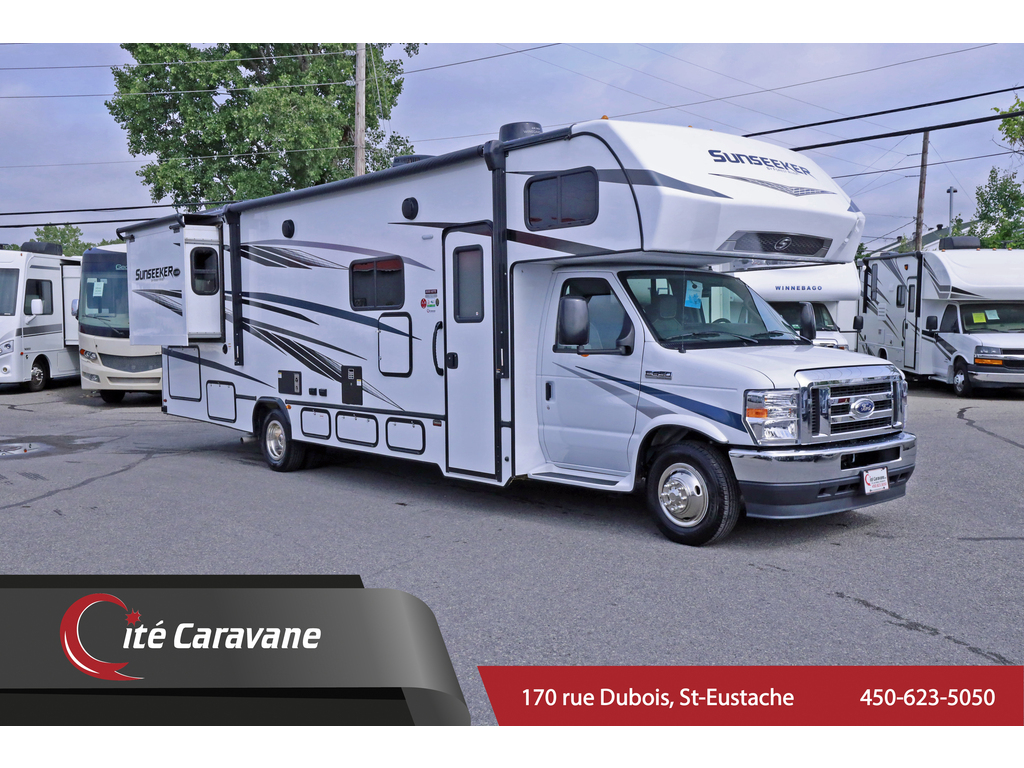 Forest River Sunseeker 3010 2 extension CLASSE C + crics hydraulics Tissu :platinium , boiseries : Black diamond walnut, Ford 7.3L v8 Prise 30AMP , chauffe eau 6 gallons , chauffage 30,000BTU , A/C au toit 13.5BTU canalisé , ballons a air ride rite , murs de 2, fini gel-coat , toit en fibre de verre , auvent électrique , hitch de 7500lbs ,TV , frigidaire 10 pieds cube , tiroirs styles résidentiels , cuisinière a trois bruleur , stores de nuit , plafond de 7 pieds , génératrice de 4000watts onan, 2 batteries auxiliaires , micro-onde , sièges avant en cuirette appareils en stainless , arctic Pack ( 4 saisons ) couvert en fibre de verre , matelas Queen , Prélart a grandeur Beauflor , antenne digitale, comptoirs de luxe, *PREMIUM CAMPING PACKAGE (mirroirs chauffants/électrique, caméra de recule et latérales, cinema maison 5.1 , black tank flush) + 1336$/MOIS + taxes ! www.citecaravane.com 450-623-5050 170 RUE DUBOIS , ST-EUSTACHE, SUR LE BORD DE LA 640! UNE ENTREPRISE FAMILIALE A VOTRE SERVICE DEPUIS 1973 ! , DÉPOSITAIRE NUMÉRO 1 FOREST RIVER SUNSEEKER ! LE SPÉCIALISTE DU VR AU QUÉBEC ! Forest River Sunseeker 3010 2 slides + hydraulic jacks CLASS C fabric : platinum , wood : Black diamond walnut , Ford 7.3L V8 , 30AMP , 6 gallon water heater , 30,000BTU heater , 13.5BTU ducted roof A/C , ride rite air suspension , 2inch thick walls , gel-coat exterior , fiberglass roof , electric awning , 7500lbs hitch , spare tire , 2 TV , 10 cubic feet fridge , residential style drawers , 3 range burner oven , micro-wave , night shades , 7 feet high ceilings , 4000watts Onan generator, 2 auxiliary batteries , leatherette front seats , stainless steel appliances , arctic pack ( 4 seasons ) , fiberglass front cap , queen bed , Beauflor linoleum throughout , Digital Antenna ,Upgraded countertops,*PREMIUM CAMPING PACKAGE (heated/electric mirrors,back up and side cameras, 5.1 surround sound,black tank flush)+ 1336$/MONTH +taxes. www.citecaravane.com 450-623-5050 ! CALL US TODAY ! Cité Caravane, 170 rue Dubois in Saint-Eustache, adjacent to the 640 highway. A FAMILY OWNED BUISNESS SINCE 1973 ! QUÉBEC s RV SPECIALIST !